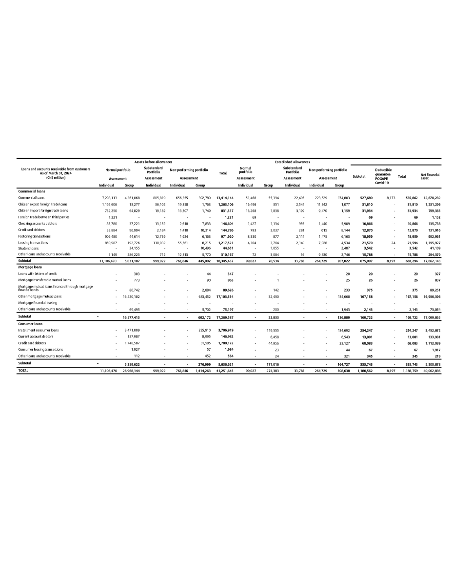 L oa n s a n d a cc o u n t s re c e i v a b l e f r o m c u s t om er s a s of m a r c h 31,2024(C H $ m i ll i o n)A SS e t s b e fo r e a ll o w a n c e s substandard t o t a l e s t a b l i s h e d a ll o w a n c e s substandard n o n-p er fo r m i n g p o r t fo l i o assessment Normal portfolio a ss e ss m e nt individual n o n-p er fo r m i ng p o r t fo l i o assessment n o r ma l p o r t fo l i o assessment individual group portfolio a ss e ss m e n t individual portfolio a ss e ss m e n t individual s u b t o t a l d e d u c ti b l e guarantee FOGAPE Covid-19 t o t a l n e t f i n a n c i a l a ss e t i n d i v i d u a lG r o u p G r o u p i n d i v i d u a l g r o u p c omm er c i a l oa n s 12,878,282535,8628,173527,689174,803223,52922,49555,39451,46813,414,144392,789656,355805,8194,261,068商业贷款7,298,1131,231,29631,810-31,8101,07711,3422,54435116,4961,263,1061,76319,35836,10213,277智利出口外贸贷款1,192,606799,38331,934-31,9341,1599,4703,1991,83816,268831--691,221-----第三方对外贸易1,221135,73810,866-10,8665,9091,4409561,1341,427146,6047,8332,61813,15237,221支票账户债务人85,780131,91612,870-12,8708,1446152813,037793144,78610,3141,4102,18496,994信用卡债务人33,884952,96118,959-18,9596,1631,4752,1148778,330971,9206,1631,92412,73944,614保理交易906,4801,195,92721,5942421,5704,5347,0282,贷款-294,37915,788-15,7882,7469,830563,08472310,1675,77012,313712286,223其他贷款和应收账款5,14917,662,143683,2948,197675,097207,022264,72933,78570,53 499,02718,345,437445,092762,846 999,9225,031,107小计11,106,47032720----34744--303 M ortgage loans with letters-83726-2625--1-86390--773 mortgage transferable mutual loans-89,251375-375233--142-89,6262,884---86,742 m o r t gage mutu al l o a n s fi n a n ced th r ou gh mo r t格奇金融债券-16,936,396167,158-167,158134,668---32,490-17,103,554683,452---16,420,102其他抵押互助贷款-------------抵押融资租赁-73,0542,143-2,1431,943---200-75,1975,702--69,495其他贷款应收账款-17,099,865169,722-169,722136,889--32,833-17,269,587692,172--16,577,415小计-3,452,672254,247-254,247134,692--119,555-3,706,919235,910--3,471,009 Con s u me r贷款分期消费贷款-133,98113,001-13,0016,543--6,458-146,9828,995--137,987经常账户债务人-1,712,08968,083-68,08323,127--44,956-1,780,17231,585--1,748,587信用卡债务人-345321--24-564452--112其他贷款和应收账款-5,300,878335,743-335,743164,727--171,016-5,636,621276,999--5,359,622小计-40,062,8861,188,7598,1971,180,562508,638264,72933,785274,38399,02741,251,6451,414,263762,846999,92226,968,144合计11,106,470