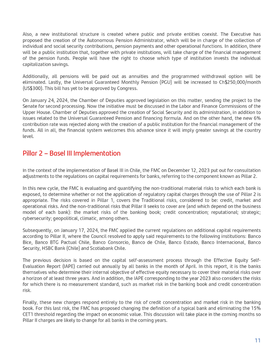 11此外,还创建了一个公共和私营实体共存的新体制结构。行政长官建议成立自治养老金管理人,将负责个人和社会保障缴费的征收、养老金支付等运营职能。此外,还将有一个公共机构,与私营机构一起,负责养老基金的财务管理。人们将有权选择哪类机构投资个人资本化储蓄。此外,所有养老金将作为年金支付,程序化提取选项将被取消。最后,将全民保证每月养老金(PGU)提高到250,000瑞士法郎/月(300美元)。这项法案尚待国会批准。2024年1月24日,众议院批准了关于此事的立法,将该项目送交参议院进行第二次处理。现在必须在上议院的劳工和财政委员会讨论这项倡议。众议院批准创建社会保障及其管理,此外还有与全民保障养老金和筹资公式有关的问题。而另一方面,新的6%的缴费费率,则随着创建事业单位对资金进行财务管理而被否决。总而言之,金融系统对这一进展表示欢迎,因为这将意味着在国家一级有更多的储蓄。支柱2 –巴塞尔协议III实施i在智利实施巴塞尔协议III的背景下,2023年12月12日,FMC就银行资本要求规定提出了征求意见的调整,提到了被称为支柱2的组成部分。在这个新周期中,FMC正在评估和量化每家银行面临的非传统重大风险,以确定通过使用支柱2应用监管资本收费是否合适。支柱1涵盖的风险,涵盖了传统风险,被认为是:信用、市场和操作风险。而第二支柱寻求覆盖的非传统风险是(并且取决于每家银行的商业模式):银行账簿的市场风险;信贷集中度;声誉;战略;网络安全;地缘政治、气候等。随后,在2024年1月17日,FMC根据第二支柱应用了关于额外资本要求的现行法规,理事会决议将上述要求应用于以下机构:Banco Bice、Banco丨BTG丨PPactual Chile、Banco Consorcio、Banco de Chile、Banco Estado、Banco Internacional、Banco Security、HSBC Bank(Chile)和Scotiabank Chile。此前的决定是基于所有银行在4月份每年进行的有效股权自评估报告(IAPE)的资本自评估过程。在这份报告中,是银行自己确定了在至少三年的期限内覆盖其重大风险所必需的有效股权的内部目标。并且,对应2023年的IAPE还考虑了没有计量标准的风险,如银行账簿的市场风险、信贷集中度风险等。最后,这些新收费完全对应了银行账簿上的信贷集中风险和市场风险。对于最后一种风险,FMC建议更改典型银行的定义,并取消关于对经济价值影响的15% CET 1阈值。这一讨论将在未来几个月进行,因此未来几年所有银行的第二支柱收费可能会发生变化。