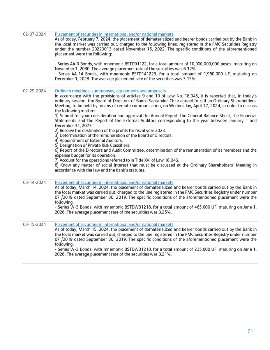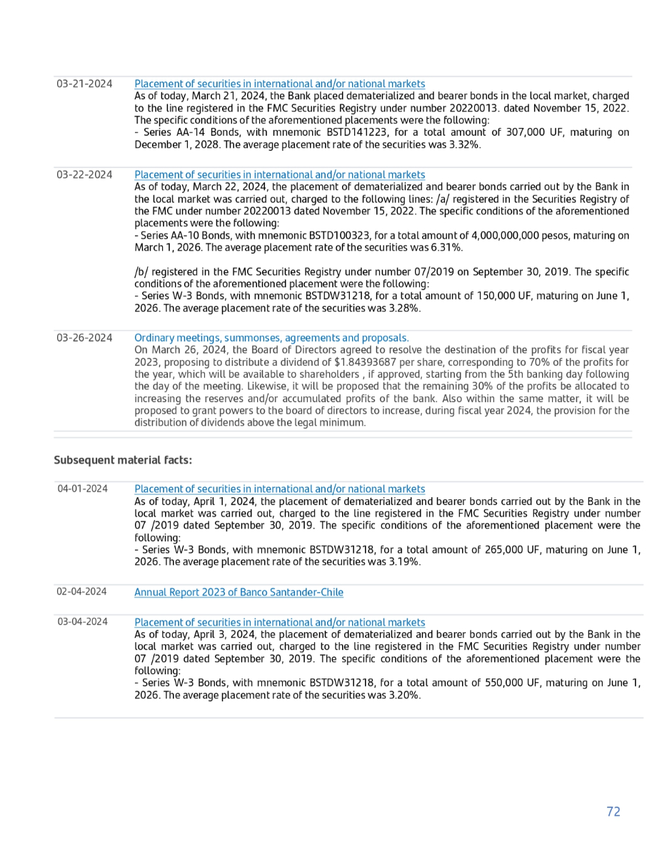 02-07-2024 P l a c e m en t o f s e c u r iti e s i n i n t e r n a ti o n a l a nd/or n a ti o n a l a nd/or n a ti o n a l m a r k e t s截至2024年2月7日今日,本行在当地市场开展的非实质化和无记名债券配售业务,计入以下各行,于2022年11月15日在FMC证券注册处注册,编号为20220013。上述配售的具体条件如下:-系列AA-9债券,助记符BSTD91122,总金额为10,000,000,000比索,于2030年11月1日到期。证券的平均配售率为6。12 % .-AA系列-14期债券,助记符BSTD 141223,总金额1950.000用友,2028年12月1日到期。证券的平均配售率为3。15 % .02-29-2024年常会、传票、协议和提案。根据第18、045号法第9条和第10条的规定,据悉,在今天的常会上,桑坦德银行-智利董事会同意于2024年4月17日(星期三)召开普通股东大会,以远程通讯方式召开,以讨论以下事项:1)提交年度报告、总资产负债表、财务报表及2023年1月1日至12月31日期间对应年度的外聘审计员报告。2)解决2023财年利润的去向。3)董事会薪酬的确定。4)A pp o i n tm en t o f e x t e r n a l a ud it或s。5)指定私人风险分类器。6)董事和审计委员会的报告,确定其成员的薪酬和其运营的费用预算。7)对第18、046号法律第16条所指的操作进行会计处理。8)知道任何社会利益事项,根据法律和银行章程,必须在普通股东大会上讨论。03-14-2024 P l a c e m en t o f s e c u r iti e s i n i n t e r n a ti o n a l a nd/or n a ti o n a l m a r k e t s截至今日,2024年3月14日,本行在当地市场进行的非实质化和无记名债券的配售,收费至于2019年9月30日在FMC证券注册处根据编号07/2019注册的行。上述配售的具体条件如下:-系列W-3债券,助记符BSTDW 31218,总金额46.5万用友,2026年6月1日到期。证券的平均配售率为3。25 % .03-15-2024 P l a c e m en t o f s e c u r iti e s i n i n t e r n a ti o n a l a nd/or n a ti o n a l m a r k e t s截至今日,2024年3月15日,本行在当地市场进行的非实质化和无记名债券的配售,收费至2019年9月30日于FMC证券注册处根据编号07/2019登记的行。上述配售的具体条件如下:-W-3系列债券,助记符BSTDW 31218,总金额23.5万用友,2026年6月1日到期。证券的平均配售率为3。21 % .71