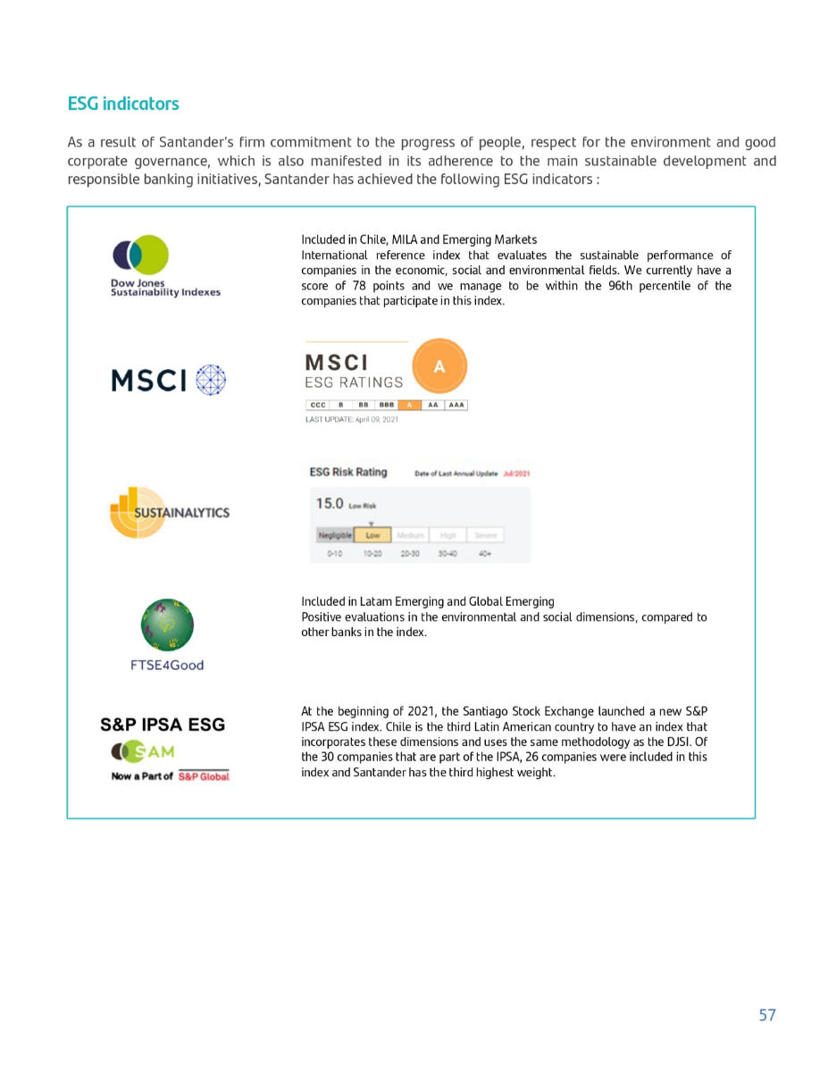 E S G in d i c a t o r s由于桑坦德银行坚定致力于人的进步、尊重环境和良好的公司治理,这也表现在其坚持主要的可持续发展和负责任的银行倡议,桑坦德银行实现了以下ESG指标:纳入智利、MILA和新兴市场国际参考指数,评估公司在经济、社会和环境领域的可持续表现。我们目前的得分是78分,我们设法在c o m p a n i e e e e e e e e e e e e e e e e e e e e e e e e e e e e e e e e e e e e e e e e e e e e e e e e e e e e e e e e e e e e e e e e e e e e e e e e e e e e e e e e e e e e e e e e e e e e e e e e e e e e e e e e e e e e e e e e e e e e e e e e e e e e e e e e e e e e e e e e e e e e e e e e e e e e e e e e e e e e e e e e e e e e e e e e e e e e e e e e e e与指数中的其他银行相比,在环境和社会层面被纳入Latam Emerging和Global Emerging正面评价。2021年初,圣地亚哥证券交易所推出了新的标普 IPSA ESG指数。智利是第三个拥有纳入这些维度并使用与DJSI相同方法的指数的拉丁美洲国家。在加入IPSA的30家公司中,有26家公司被纳入该指数,桑坦德银行的权重排名第三。57