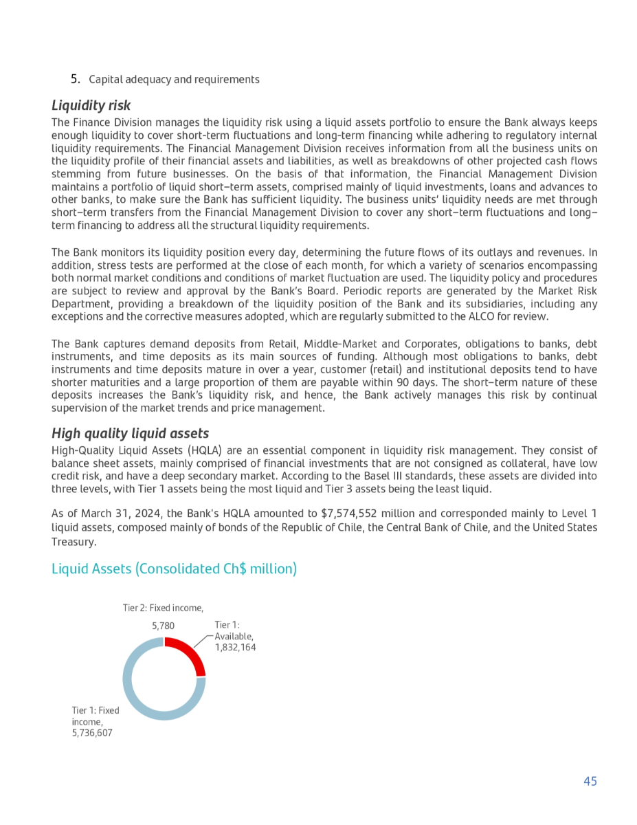 5.资本充足性和要求Li q u i d i t y r i s k财务部门使用流动性资产组合管理流动性风险,以确保银行始终保持足够的流动性以覆盖短期波动和长期融资,同时遵守监管内部流动性要求。财务管理司从所有业务部门收到有关其金融资产和负债的流动性状况的信息,以及来自未来业务的其他预计现金流量的细目。根据这些信息,财务管理司维持一个流动性短期资产组合,主要由流动性投资、贷款和对其他银行的垫款组成,以确保银行有充足的流动性。业务部门的流动性需求通过财务管理部的短期转账来满足,以覆盖任何短期波动和长期融资,以满足所有结构性流动性需求。该银行每天监测其流动性状况,确定其支出和收入的未来流动。此外,在每个月的收盘时进行压力测试,对其使用既包含正常市场条件又包含市场波动条件的多种情景。流动性政策和程序须经本行董事会审议批准。定期报告由市场风险部生成,提供银行及其子公司流动性状况的明细,包括任何例外情况和采取的纠正措施,并定期提交给ALCO审查。该银行将来自零售、中间市场和企业的活期存款、对银行的债务、债务工具和定期存款作为其主要资金来源。虽然对银行的债务、债务工具和定期存款大多在一年以上到期,但客户(零售)和机构存款的期限往往较短,其中很大一部分在90天内支付。这些存款的短期性增加了银行的流动性风险,因此,银行通过对市场走势的持续监管和价格管理,积极管理这一风险。H i g h q u a l i t y l i q u i d a ss e t s优质流动资产(HQLA)是流动性风险管理的重要组成部分。它们由资产负债表资产组成,主要由不作为抵押品委托、信用风险较低、二级市场较深的金融投资组成。根据巴塞尔III标准,这些资产分为三个等级,一级资产是流动性最强的,三级资产是流动性最差的。截至2024年3月31日,该银行的HQLA为7、5.74、5.52亿美元,主要对应于1级流动性资产,主要由智利共和国债券、智利中央银行债券、美国财政部债券组成。L i qu i d a ss e t s(c o n s o l i d a t e d c h $ mi ll i o n)t i e r 2:f i x e d i n c o m e,5,78045 t i e r 1:available,1,832,164 t i e r 1:f i x e d income,5,736,607