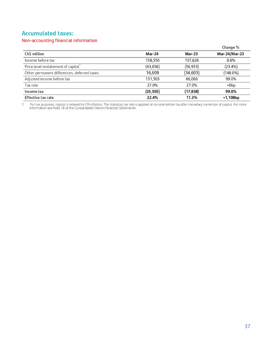 37累计税金:变动%非会计财务信息MAR-24/MAR-23 MAR-23 MAR-24 CH百万0.6% 157,626158,550税前收入(23.4%)(56,955)(43,656)价格水平重述人均l 1(148.0%)(34,605)16,609其他永久性差异,递延税项99.0% 66,066131,503调整后税前收入+ 0bp27.0 % 27.0%税率99.0%(17,838)(35,505)所得税+ 1,108bp11.3 % 22.4%有效税率1。出于税收目的,资本与CPI通胀挂钩。资本货币更正后的税前收入适用法定税率。更多信息见综合中期财务报表附注18。