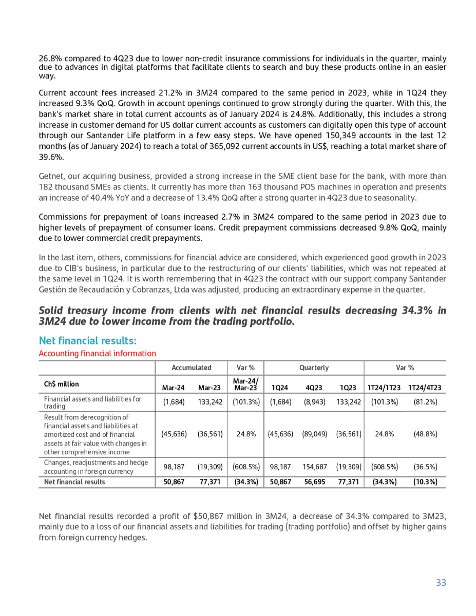 33 26 .与4Q23相比下降8%,原因是本季度个人的非信用保险佣金降低,这主要是由于数字平台的进步,方便客户以更简单的方式在线搜索和购买这些产品。经常账户费用增加21。与2023年同期相比,3M24增长了2%,而1Q24增长了9。环比3%。本季度开户增长继续强劲增长。据此,截至2024年1月,该行在总经常账户中的市场份额为24。8 % .此外,这还包括客户对美元活期账户的需求强劲增长,因为客户可以通过我们的Santander Life平台通过几个简单的步骤以数字方式开立这类账户。我们在最近12个月(截至2024年1月)共开立了150个、349个账户,达到了365,092个美元活期账户,达到了39个的总市场份额。6 % .我们的收单业务Getnet为银行提供了强劲的中小企业客户群增长,客户超过18.2万家中小企业。目前在运营的POS机超过16.3万台,呈现40台的增长。同比下降4%,降幅为13。由于季节性因素,在23年前4季度表现强劲后,环比增长4%。提前还贷佣金增加2。由于更高水平的消费者贷款提前还款,3M24较2023年同期下降7%。信贷提前还款佣金减少9。环比8%,主要由于商业信贷预付款减少。在最后一项其他中,考虑了财务建议佣金,由于CIB的业务,该业务在2023年经历了良好的增长,特别是由于我们客户的负债重组,这在1Q 24的同一水平上没有重复。值得记住的是,在4 Q23,与我们的支持公司Santander Gesti ó n de Recaudaci ó n y Cobranzas,Ltda的合同进行了调整,在该季度产生了一笔非常大的开支。由于交易组合的收入减少,净财务业绩在3M24的客户的固定财资收入减少了34.3%。N e t f i n a n c i a l r e s u l t s:a cc o un ti ng f i n a n c i a l i n f or m a ti o n var % quarterly var % accumulated 1t24/1t23 1t24/4t23 1Q23 4q23 1Q24 mar-24/mar-23 mar-23 mar-24 ch $ million(81.2%)(101.3%)133,242(8,943)(1,684)(101.3%)133,242(1,684)用于交易的金融资产和负债(48.8%)24.8%(36,561)(89,049)(45,636)24.8%(36,561)(45,636)金融资产终止确认结果以摊余成本计负债及以公允价值计量且有其他综合收益变动的金融资产(36.5%)(608.5%)(19,309)154,68798,187(608.5%)(19,309)98,187外币变动、调整及套期会计(10.3%)(34.3%)77,37156,69550,867(34.3%)77,37150,867净财务业绩净财务业绩录得溢利50美元,3M24为8.67亿元,减少34。3%,较300万23,主要由于我们的交易金融资产和负债(交易组合)的损失,并被外币对冲带来的更高收益所抵消。