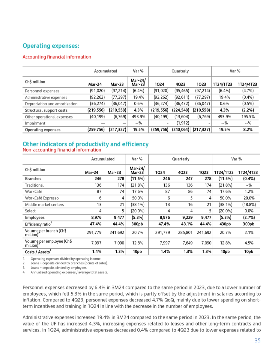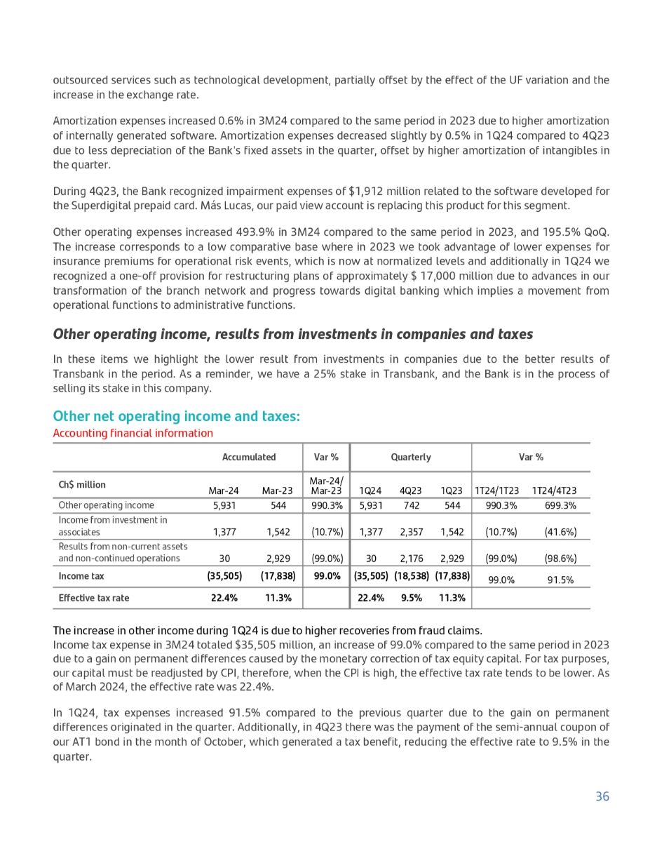 36项技术开发等外包服务,部分被用友变异和汇率上升的影响所抵消。摊销费用增加0。由于内部生成的软件摊销增加,3M24较2023年同期增长6%。摊销费用微降0。由于本季度该行固定资产折旧减少,被本季度较高的无形资产摊销所抵消,24年1季度较23年4季度下降5%。在4 QQ23期间,该银行确认了与Superdigital预付卡开发的软件相关的1.9.12亿美元的减值费用。M á s Lucas,我们的付费视图账户正在为这一细分市场取代这一产品。其他经营开支增加493。与2023年同期相比,3M24为9%,195。环比5%。这一增长对应的是较低的比较基数,在2023年,我们利用较低的运营风险事件保险费支出,目前处于正常化水平,此外,在24年第一季度,我们确认了一笔约1700亿美元的重组计划一次性拨备,原因是我们在分行网络转型方面取得进展,以及向数字银行方面取得进展,这意味着从运营职能转向行政职能。其他营业收入、对公司投资的结果和税收在这些项目中,我们强调由于Transbank在该期间的更好结果,对公司的投资结果较低。提醒一下,我们持有Transbank 25%的股份,该行正在出售其在这家公司的股份。O t h e r n e t o p e r a t i n g i n c o m e a n d t a x e s:a cc o un ti ng f i n a n c i a l i n f或m a ti o n var %季度var %累计1t24/4t23 1t24/1t23 1Q23 4q23 1Q24 mar-24/mar-23 mar-23 mar-23 mar-24 ch $ million 699.3% 990.3% 5447425,931990.3% 5445,931其他营业收入(41.6%)(10.7%)1,5422,3571,377(10.7%)1,5421,377联营公司投资收益(98.6%)(99.0%)2,9292,17630(99.0%)2,92930非流动资产业绩及非持续经营业务91.5% 99.0%(17,838)(18,538)(35,505)99.0%(17,838)(35,505)所得税11.3% 9.5% 22.4% 11.3% 22.4%有效税率1 Q24期间其他收入的增加是由于欺诈索赔的更高回收率。所得税费用在3M24总计$ 35,5.05亿,增加99。与2023年同期相比为0%,原因是税收权益资本的货币更正导致的永久差异收益。出于税收目的,我们的资本必须根据CPI进行重新调整,因此,当CPI较高时,有效税率往往较低。截至2024年3月,有效率为22。4 % .24年1季度税收支出增加91。与上一季度相比增长5%,原因是本季度产生的永久差异收益。此外,在4 Q23有支付我们AT 1债券的半年期票息在10月份,这产生了税收优惠,降低了有效利率到9。本季度为5%。