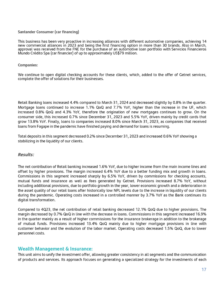 17 S A nt A n d e r C o n s u m e r(c a r f in a n c in g)该业务一直非常主动地增加与不同汽车公司的联盟,在2023年实现了14个新的商业联盟,并在30多个品牌中成为第一个融资选项。同样在3月份,FNE批准与Servicios Financieros Mundo Cr é dito Spa(汽车金融家)购买高达约7900万美元的汽车贷款组合。公司:我们继续为这些客户开设数字支票账户,这些账户在提供Getnet服务的基础上,完成了为其业务提供解决方案的工作。零售银行贷款增加4。与2024年3月31日相比下降4%,小幅下降0。本季度8%。按揭贷款继续增加1。环比下降1%,环比上升7。同比增长7%,高于上年同期增长0。环比8%,环比4。同比3%,因此新抵押贷款的发起持续增长。在消费者方面,这增加了0。自2023年12月31日以来的7%和5。同比增长5%,主要受信用卡增长推动13。同比8%。最后,对企业的贷款增加8。自2023年3月31日以来为0%,因为在大流行期间从Fogape获得贷款的公司已经完成付款,贷款需求正在恢复。该分部的存款总额自2023年12月31日以来下降0.2%,同比增长0.6%,显示我们客户的流动性趋于稳定。结果:零售银行业务净贡献增加1。同比6%,因主要收入项目收入增加,并被较高拨备抵消。保证金增加6。同比4%,原因是资金组合改善和贷款增长。这一细分领域的佣金大幅增加6。同比增长5%,受支票账户、共同基金和保险佣金以及Getnet产生的费用推动。拨备增加8。同比7%,不包括额外拨备,原因是年内投资组合增长、经济增长放缓以及由于疫情期间客户流动性增加导致我们的客户的不良贷款水平处于历史低位后,我们的零售贷款的资产质量恶化。营业成本受控增长3。银行继续数字化转型,同比增长7%。与4 Q23相比,零售银行业务的净贡献减少12。由于拨备增加,环比增长1%。幅度减少0。与贷款环比下降7%一致。这一部分的佣金增加了16。本季度9%,主要是由于除共同基金经纪业务外,保险经纪业务的佣金增加。拨备增加13。环比4%,主要是由于符合客户行为和劳动力市场演变的更高的抵押贷款拨备。营业成本下降1。环比5%,因人员成本下降。W e a l t h m a n a g e m e nt & i n s u r a n c e:这个单元旨在统一投资报价,允许在所有细分领域以及产品和服务的交流中实现更大的一致性。它的方法侧重于为每个人的投资制定一个专门的战略