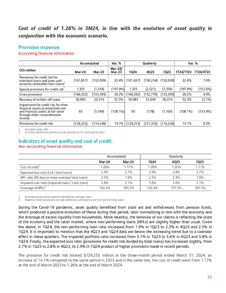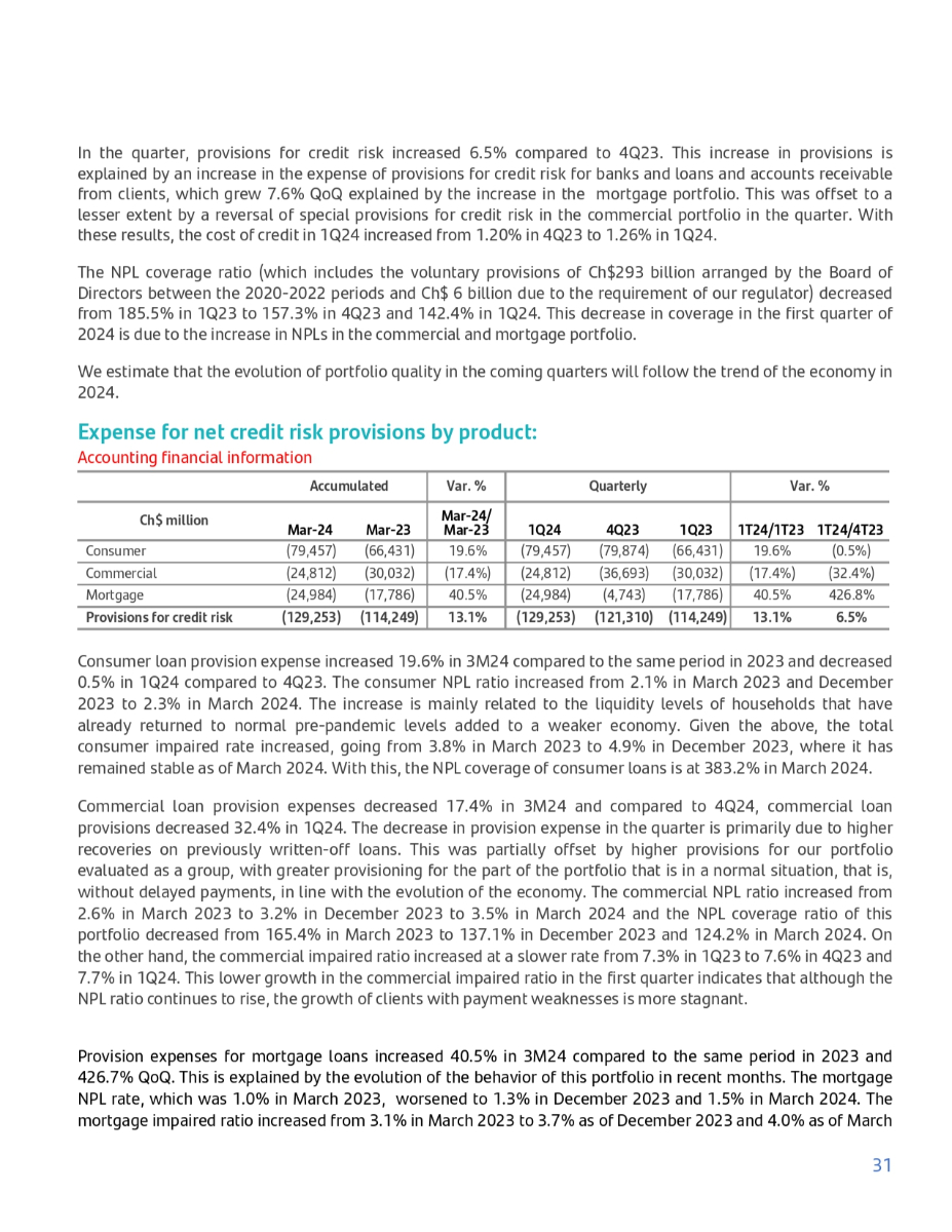 30 3M24信用成本1.26%,配合经济情景下资产质量演变。P r o v i s i o n e x p e n s e:a CC o un ti ng f i n a n c i a l i n f或m a ti o n var。%季度变量。累计% 1T24/4T23 1T24/1T23 1Q23 4Q23 1Q24 Mar-24/Mar-23 Mar-23 Mar-23 Mar-24 CH $百万7.6% 22.4%(132,039)(150,254)(161,657)22.4%(132,039)(161,657)同业借款信用风险准备及1项应收客户款项(197.9%)(152.6%)(1,354)(2,521)1,325(197.9%)(1,354)1,325信贷特别拨备RIS K2 4.9% 20.2%(133,393)(152,776)(160,332)20.2%(133,393)(160,332)毛拨备52.5%(2.1%)20,31431,64330,98352.5% 20,31430,983收回核销贷款(108.1%)(153.4%)(1,169)(178)95(108.1%)(1,169)95其他以摊余成本计量的金融资产和以公允价值计量且其变动计入其他综合收益的金融资产的信用风险减值6.5% 13.1%(114,249)(121,310)(129,253)13.1%(114i n c l u d e s w r it e-o ff s。2.包括额外准备金和或有贷款准备金。I n d i c a t o r s of ass e t q u a l i t y a n d c o s t of c r e d i t:n o n-a c o un ti ng f i n a n c i a l i n f或m a ti o n季度累计1Q23 4Q23 1Q24 Mar-23 Mar-24 1.17% 1.20% 1.26% 1.17% 1.26% Cost of credit t 12.7% 2.8% 2.9% 2.7% 2.9%预期损失率(LLA/贷款总额)1.9% 2.3% 2.5% 1.9% 2.5%不良率(逾期90天以上/贷款总额)5.1% 5.6% 5.8% 5.1% 5.8%减值贷款率(减值贷款/贷款总额)185.5% 157.3% 142.4% 185.5% 142.4%不良贷款覆盖率21。年化拨备费用除以平均贷款。2.资产负债表拨备包括对不良贷款的额外拨备。在Covid-19大流行期间,资产质量受益于国家援助和养老基金的提款,这在该期间产生了这些积极演变,后来随着经济和家庭过剩流动性的引流而正常化。最近,我们客户的行为反映了经济和劳动力市场的状况,不良贷款(NPLs)比平时略高。鉴于上述情况,24年1季度,不良贷款率从1。23至2季度1季度9%。4 Q23和2的3%。24年第一季度5%。值得一提的是,由于这些季度的日历效应,4 Q23和1 Q24数据低于增长趋势。减值投资组合比率从5。1季度23至5季度的1%。4 Q23和5的6%。24年第一季度8%。最后,预期损失率(信用风险准备除以贷款总额)略有上升,从2。23至2季度1季度7%。23年第4季度8%,降至2。9% in 1Q 24 product of higher provisions made in recent periods。信贷风险拨备总额1.29亿美元,截至2024年3月31日的三个月期间为2.53亿,增加14。与2023年同期相比1%,在同一条线上,信贷成本从1。2023年3月底的17%至1。2024年3月底为26%。