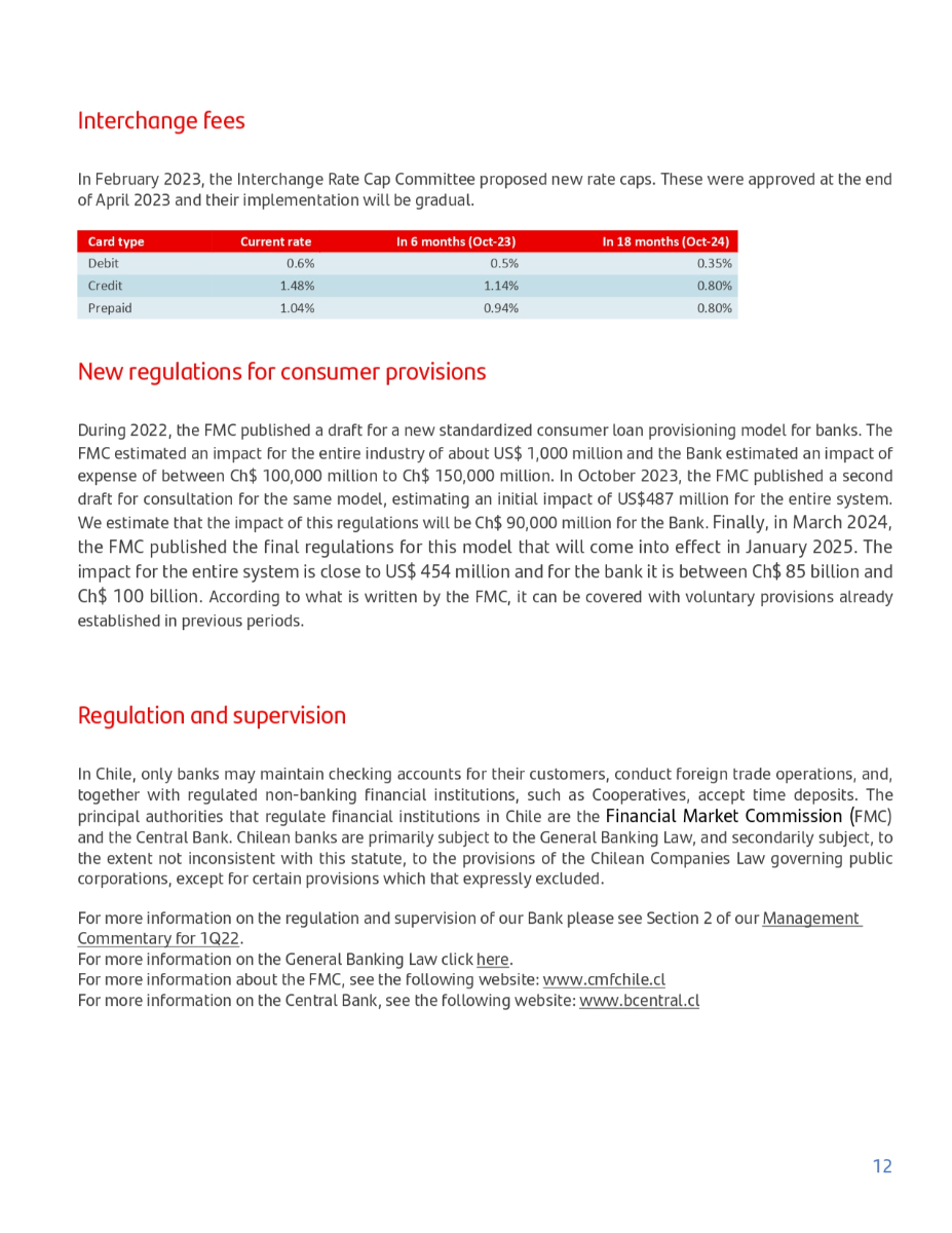 12 i n t e r c h a n g e f ee s 2023年2月,交换利率上限委员会提出新的利率上限。这些于2023年4月底获批,将逐步实施。18个月内(10月24日)6个月内(10月23日)活期利率卡类0.35% 0.5% 0.6%借方0.80% 1.14% 1.48%信用0.80% 0.94% 1.04%预付款项2022年期间,FMC公开了一份针对银行的新的标准化消费贷款拨备模式征求意见稿。FMC估计对整个行业的影响约为10亿美元,该行估计费用影响在10亿至1.5亿瑞士法郎之间。2023年10月,FMC发布了针对同一型号的第二次征求意见稿,估计对整个系统的初步影响为4.87亿美元。我们估计,这一规定的影响将为银行带来9亿瑞士法郎。最终,在2024年3月,FMC公布了该车型的最终法规,将于2025年1月生效。对整个系统的影响接近4.54亿美元,对银行的影响在850亿至1000亿瑞士法郎之间。根据FMC的规定,它可以使用前期已经建立的自愿条款进行覆盖。R e g u l a ti o n a n d s u p e r v i s i o n在智利,只有银行可以为其客户维持支票账户,开展外贸业务,并与合作社等受监管的非银行金融机构一起接受定期存款。智利监管金融机构的主要机构是金融市场委员会(FMC)和中央银行。智利的银行主要受《一般银行法》的约束,其次在不违反本法规的范围内受《智利公司法》关于公共公司的规定的约束,但明确排除的某些规定除外。关于我行监管监管的更多信息,请见我们2022年第一季度管理层评论的第二节。有关《一般银行法》的更多信息,请点击这里。更多关于FMC的信息,请参见以下网站:www.cmfchile.cl更多关于央行的信息,请参见以下网站:www.bcentral.cl