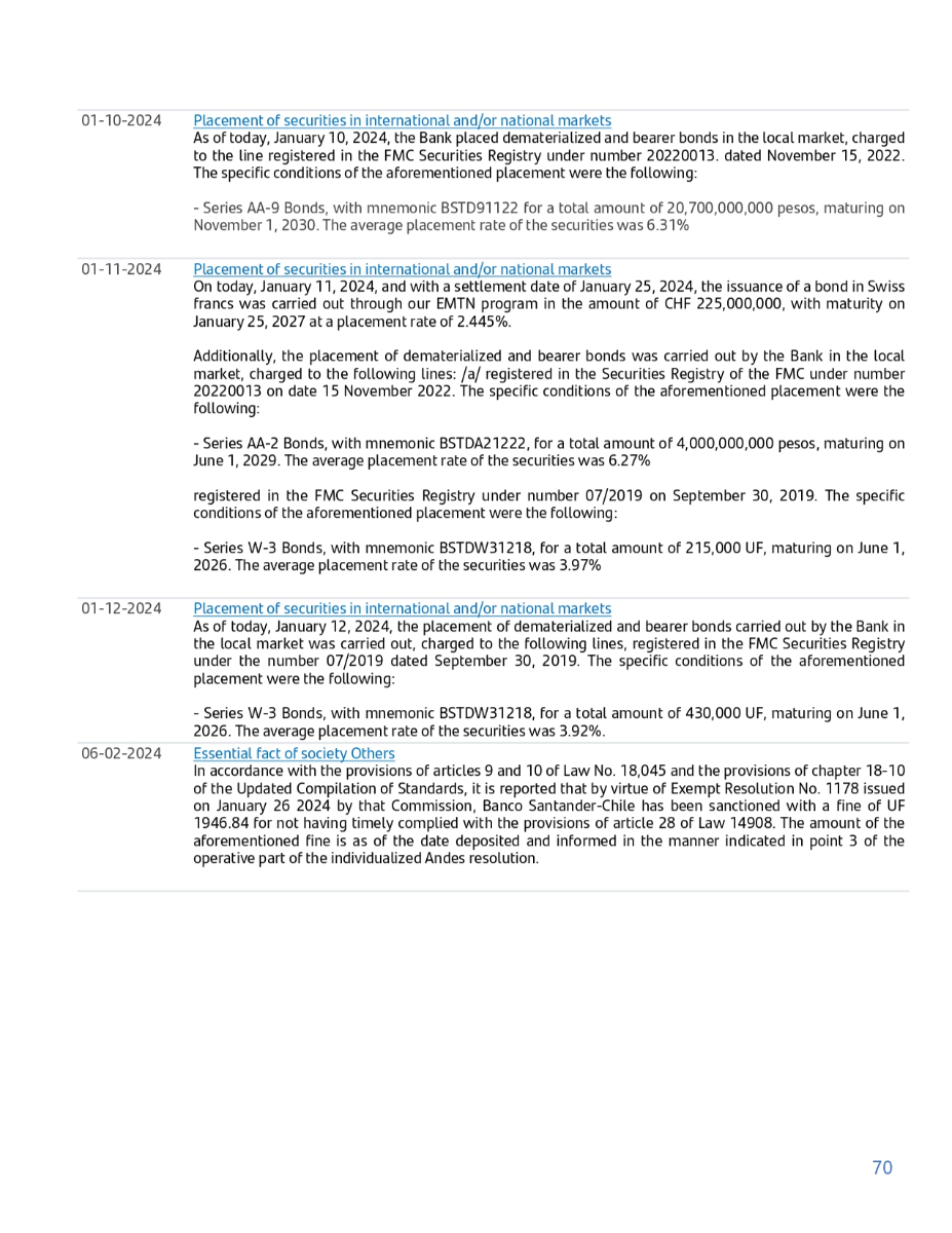 01-10-2024 P l a c e m en t o f s e c u r iti e s i n i n t e r n a ti o n a l a nd/or n a ti o n a l a nd/or a ti o n a l m a r k e t s截至今日即2024年1月10日,本行在当地市场配售非实物化和不记名债券,记入2022年11月15日在FMC证券登记处登记的编号为20220013的额度。T he s pe c i f i c c o nd iti o n s o f t he a f or e m en ti o ned p l a c e m en t w e r e he f o ll o w i ng:-系列AA-9债券,助记符BSTD 91122,总金额20,700,000,000比索,于2030年11月1日到期。证券的平均配售率为6。31% 01-11-2024 P l a c e m en t o f s e c u r it e s i n i n t e r n a ti o n a l a nd/or n a ti o n a l m a r k e t s于今天,即2024年1月11日,结算日期为2024年1月25日,通过我们的EMTN计划发行了一笔金额为225瑞士法郎的瑞士法郎债券,0000.000,2027年1月25日到期,配售利率为2。445 % .此外,非物质化和无记名债券的配售由该行在当地市场进行,按以下项目收取:/a/于2022年11月15日在编号为20220013的FMC证券登记处登记。上述配售的具体条件如下:-系列AA-2债券,助记符BSTDA21222,总金额为400,000,000比索,于2029年6月1日到期。证券的平均配售率为6。27%于2019年9月30日在FMC证券登记处根据编号07/2019登记。具体c o nd iti o n s o f t he a f或e m en ti o ned p l a c e m en t w e r e e e e e e e e e e e e e e e e e e e e e e e e e e e e e e e e e e e e e e e e e e e e e e e e e e e e e e e e e e e e e e e e e e e e e e e e e e e e e e e e e e e e e e e e e e e e e e e e e e e e e e e e e e e e e e e e e e e e证券的平均配售率为3。97% 01-12-202406-02-2024P l a c e m en t o f s e c u r iti e s i n i n t e r n a ti o n a l a nd/or n a ti o n a l m a r k e t s截至今天2024年1月12日,本行在当地市场开展的非物质化和无记名债券的配售,计入以下各行,于2019年9月30日在FMC证券注册处注册,编号为07/2019。上述配售的具体条件如下:-系列W-3债券,助记符BSTDW 31218,总金额430万用友,2026年6月1日到期。证券的平均配售率为3。92 % .社会基本事实其他根据第18、045号法律第9条和第10条的规定以及标准增订汇编第18-10章的规定,据悉,凭借该委员会于2024年1月26日发布的第1178号豁免决议,桑坦德银行-智利已受到UF1946罚款的制裁。84因未及时遵守第14908号法第28条的规定。上述罚款金额截至按个别化安第斯决议执行部分第3点所示方式存入和告知之日。70