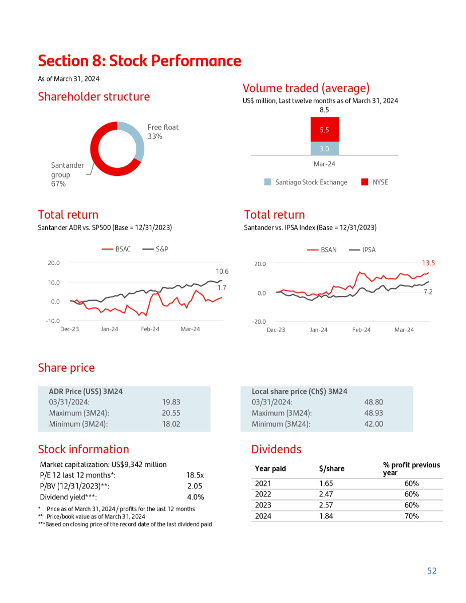 第8节:股票表现A s o f m a r c h 31,2024 s h a r e h o l d e r s t r u c t u r e f r ee f l o a t 33% s a n t a nde r group 67% v o l u m e t r a d e d(a v e r a g e)百万美元,截至3月31日的过去十二个月,20248.5 3.05.5 Mar-24 S a n ti a g o s t o c k e x c ha ng e n y s e t o l r e t u r n s a n t a n de r ad r v s。S P500(b a s e = 12/31/2023)1。7 10 .6B S A C 标普 12月-1月23日-24日F e b-24m a r-24-10。0 0 .0 10 .0 20 .0 t o t a l r e t u r n Santander vs. IPSA指数(base = 12/31/2023)7。2 BSAN IPSA 13。12月5日-20.0-1月23日-24日F e b-24 m a r-240。0 20 .0s h a r e p r i c e ADR price(US $)3m24 19.8303/31/2024:20.55 maximum(3m24):18.02 minimum(3m24):local share price(CH $)3m24 03/31/2024:48.80 maximum(3m24):48.93 minimum(3m24):42.00 s t o c k i n f or m a ti o n m a r k e t c a p it a l i z a ti o n:US $ 9,342 mi ll i on p/e 12 l a s t 12 m o n t h s *:p/b v(12/31/2023)* *:d i v i dend y i e l d * * *:18。5 x 2.05 4。0% *截至2024年3月31日的价格/过去12个月的利润* * P R i c e/b oo k v a l ue a s o f m a r c h 2024年31日* * *基于上次派息股权登记日的收盘价股息%上一年的利润$/股年度支付60% 1.65 202160% 2.47 202260% 2.57202370% 1.84 202452