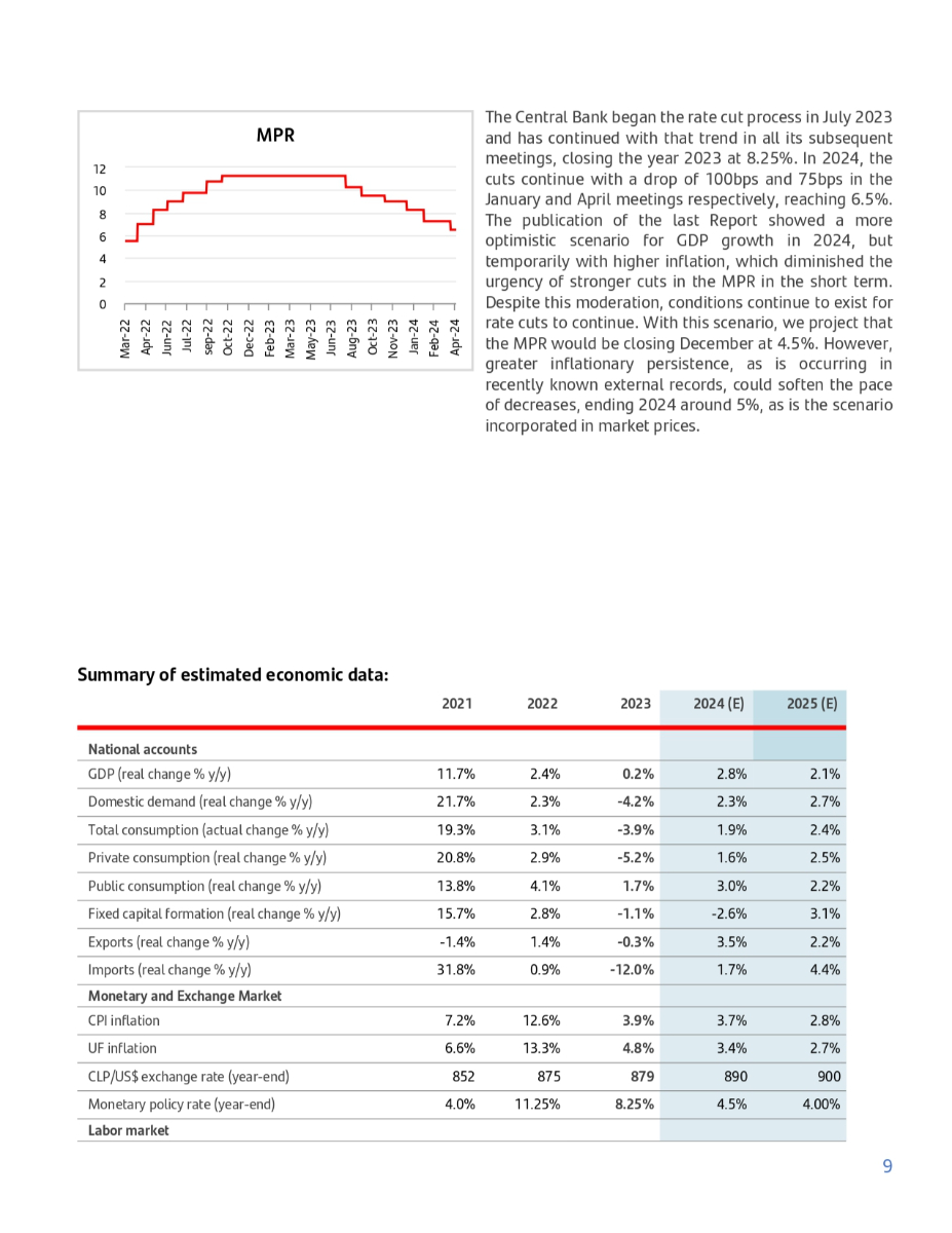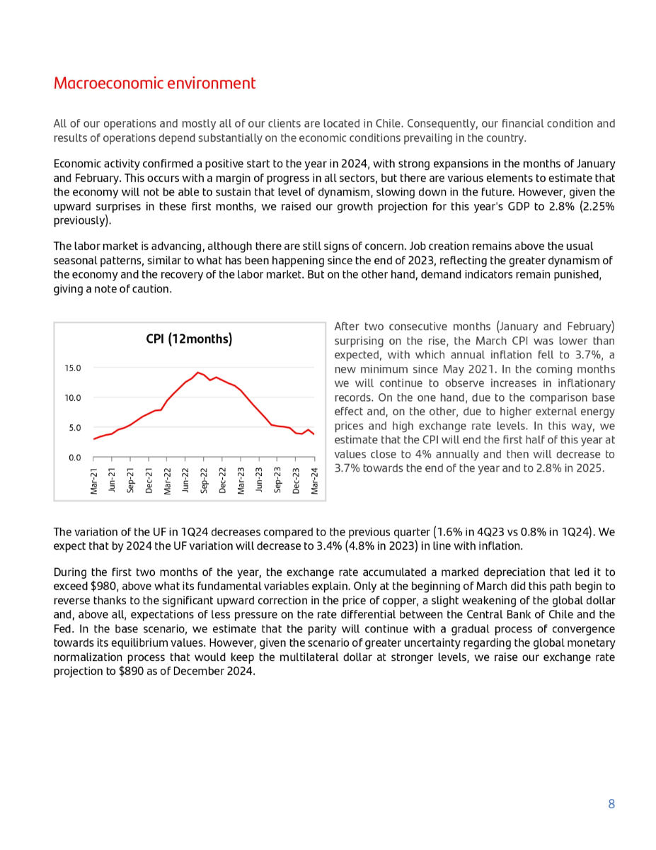 M a c r o e c o o n o m i c e n v i r o n m e n t我们所有的业务和大部分客户都位于智利。因此,我们的财政状况和经营业绩在很大程度上取决于该国当前的经济状况。经济活动在2024年确认了今年的积极开局,1月和2月出现强劲扩张。出现这种情况时,所有部门都有一定的进展,但有各种因素估计,经济将无法维持那种程度的活力,在未来放缓。然而,鉴于前几个月的上行意外,我们将今年GDP的增长预测上调至2。8 % ( 2 .此前为25%)。劳动力市场正在推进,尽管仍有令人担忧的迹象。就业创造仍高于通常的季节性模式,类似于2023年底以来发生的情况,反映出经济的更大活力和劳动力市场的复苏。但另一方面,需求指标仍然受到惩罚,给人一种谨慎的感觉。3月-21日联合国-9月21日-12月21日-21m ar-6月22日-9月22日-12月22日-22m ar-6月23日-9月23日-12月23日-23m ar-248 C P I(12m o nt h s)15.0 10.05.0 0.0在连续两个月(1月和2月)令人惊讶地上涨之后,3月CPI低于预期,随之年通胀率降至3。7%,创2021年5月以来新低。未来几个月,我们将继续观察到通胀记录的增加。一方面是由于对比基数效应,另一方面是由于外部能源价格较高和汇率水平较高。这样,我们估计今年上半年CPI的年化值将接近4%,然后将降至3。7%接近年底,至2。2025年为8%。24年第一季度财务报表的变动幅度较上季度减少(1。23年第4季度6% vs 0。24年1季度8%)。我们预计,到2024年,用友变异将降至3。4 % ( 4 .2023年8%)与通胀一致。在今年头两个月,该汇率积累了明显的贬值,导致其超过980美元,高于其基本变量所解释的水平。直到3月初,这一路径才开始逆转,这得益于铜价的显著向上修正、全球美元小幅走弱,最重要的是,对智利央行和美联储之间的息差压力较小的预期。在基数情景下,我们估计平价将继续向其均衡值逐步收敛的过程。然而,鉴于全球货币正常化进程存在更大的不确定性,这将使多边美元保持在更强的水平,我们将截至2024年12月的汇率预测上调至890美元。