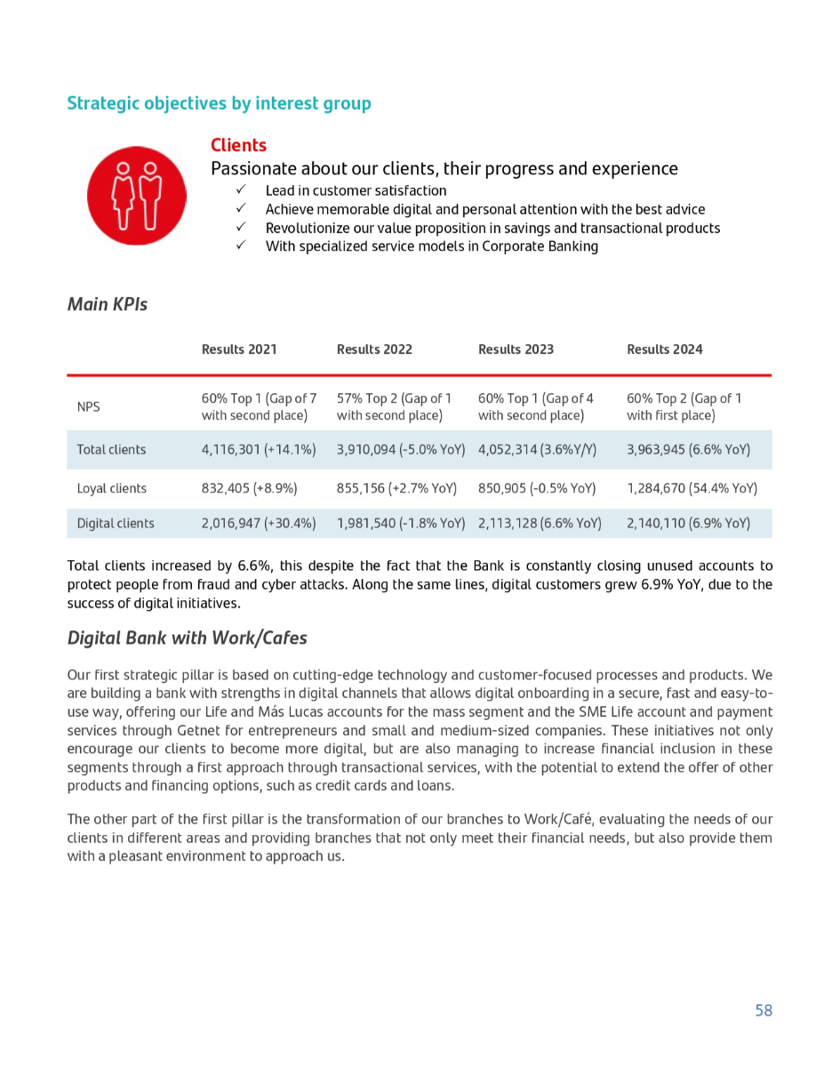 S t r a t e g i c o b j e c t i v e s b y i nt e r e s t g r o u p客户端p a ss i o n a t e a b o u t o u r c l i e n t s,t h e i r p r o g r e ss a nd e x p e r i e n c e l e a d i n c u s t o m e r s a ti s f a c ti o n用最好的建议实现令人难忘的数字和个人关注彻底改变我们在储蓄方面的价值主张与公司银行业务专业化服务模式的交易产品M a i n k p i s 2,140,110(6.9% YoY)1,981,540(-1.8% YoY)2,113,128(6.6% YoY)2,016,947(+ 30.4%)数字客户业绩2024年业绩2023年业绩2022年业绩2021年NP S 60% t o p 1(g a p o f 7 w it h s e c o nd p l a c e)57% t o p 2(g a p o f 1 w it h s e c o nd p l a c e)60%T o p 1(g a p o f 4 w it h s e c o nd p l a c e)60% t o p 2(g a p o f 1 w it h f i r s t p l a c e)t o t a l c l i en t s 4,116,301(+ 14。1 % ) 3 , 910 , 094 ( - 5 .0% Y o Y)4,052,314(3。6% Y/Y)3,963,945(6。6% Y o Y)L oy a l c l i en t s 832,405(+ 8。9 % ) 855 , 156 ( + 2 .7% Y o Y)850,905(-0。5% Y o Y)1,284,670(54。4% Y o Y)客户总数增加6。6%,尽管该银行不断关闭未使用的账户,以保护人们免受欺诈和网络攻击。同样,数字客户增长了6。同比9%,因数字化举措取得成功。D i g i t a l b a n k w i t h w o r k/c f e s我们的第一个战略支柱是基于尖端技术和以客户为中心的工艺和产品。我们正在建设一家在数字渠道方面具有优势的银行,允许以安全、快速和易于使用的方式进行数字入职,通过Getnet为企业家和中小型公司提供我们的生活和M á s Lucas账户面向大众细分市场以及中小企业生活账户和支付服务。这些举措不仅鼓励我们的客户变得更加数字化,而且正在设法通过交易服务的第一种方式增加这些细分领域的金融包容性,并有可能扩展其他产品和融资选择的提供,例如信用卡和贷款。第一支柱的另一部分是我们的分支机构向Work/Caf é的转型,评估客户在不同领域的需求,并提供分支机构,不仅满足他们的财务需求,还为他们提供一个接近我们的愉快环境。58