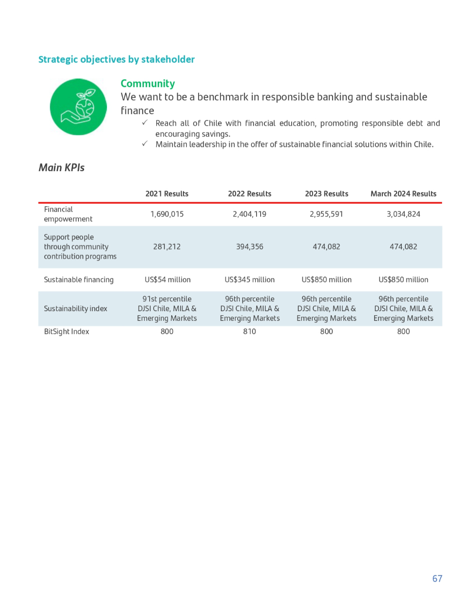 利益相关者社区的战略目标我们希望成为负责任的银行和可持续金融的标杆通过金融教育、促进负责任的债务和鼓励储蓄,覆盖智利全境。在智利提供可持续金融解决方案方面保持领导地位。M a i n k p i s 96 percentile DJSI Chile,MILA & Emerging Markets 96 percentile DJSI Chile,MILA & Emerging Markets 96 percentile DJSI Chile,MILA & Emerging Markets 91 percentile DJSI Chile,MILA & Emerging Markets Sustainability Index 2024年3月业绩2023年业绩2022年业绩2021年业绩3,034,8242,955,5912,404,1191,690,015财政赋权通过社区贡献计划支持人民281,212394,356474,082474,082 S u s t a i n a b l e f i n a n c i ng 67 US $ 54 mi ll i o n n u s $ 345 mi ll i o n n u s $ 850 mi ll i o n u s $ 850 mi ll i o n b it s i gh t i nde x 800810800800