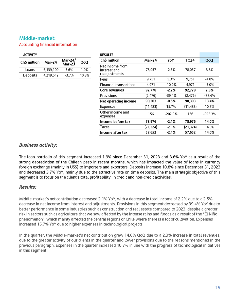 中间市场:A CC o un ti ng f i n a n c i a l i n f或m a ti o n activity m a r-24/mar-23 c h $ m i ll i o n m a r-24 q o q l o a n s 6,139,1903。6 % 1 .9% D ep o s it s 4,219,612-3。7 % 10 .8%业绩QoQ 1Q24 YoY Mar-24 CH $百万3.8% 78,057-2.5% 78,057净收入利息和调整-4.8% 9,7515.3% 9,751费用-5.0% 4,971-10.0% 4,971金融交易2.3% 92,778-2.2% 92,778核心收入-77.6%(2,476)-39.4%(2,476)拨备13.4% 90,303-0.5% 90,303净营业收入10.7%(11,483)15.7%(11,483)费用-923.3% 156-202.9% 156其他收入及费用14.0% 78,976-2.1% 78,976税前收入14.0%(21,324)-2.1%(21,324)税项14.0% 57,652-2.1% 57,652税后收入19业务活动:该分部的贷款组合增加1。自2023年12月31日以来的9%和3。同比6%,原因是近几个月智利比索大幅贬值,这影响了以货币外汇(主要是美元)向进口商和出口商提供的贷款价值。存款增加10。自2023年12月31日以来下跌8%,跌幅3。同比7%,主要由于定期存款利率具有吸引力。该分部的主要战略目标是关注客户的总盈利能力,在信贷和非信贷活动中。业绩:中间市场净贡献同比下降2.1%,总收入下降2.2%,原因是利息和调整净收入下降2.5%。该分部的拨备同比下降39.4%,原因是与2023年相比,建筑和房地产等部分行业的表现更好,尽管我们看到农业等行业因“厄尔尼诺现象”而受到强降雨和洪水的影响存在更大的风险,该现象主要影响到种植较多的智利中部地区。由于技术项目费用增加,费用同比增长15.7%。本季度,中间市场净贡献增长14。环比0%,原因是2。总收入增长3%,这是由于我们的客户在本季度的活动增加,以及由于上一段提到的原因导致拨备减少。本季度支出增加10。7%,与该细分领域的技术举措进展保持一致。