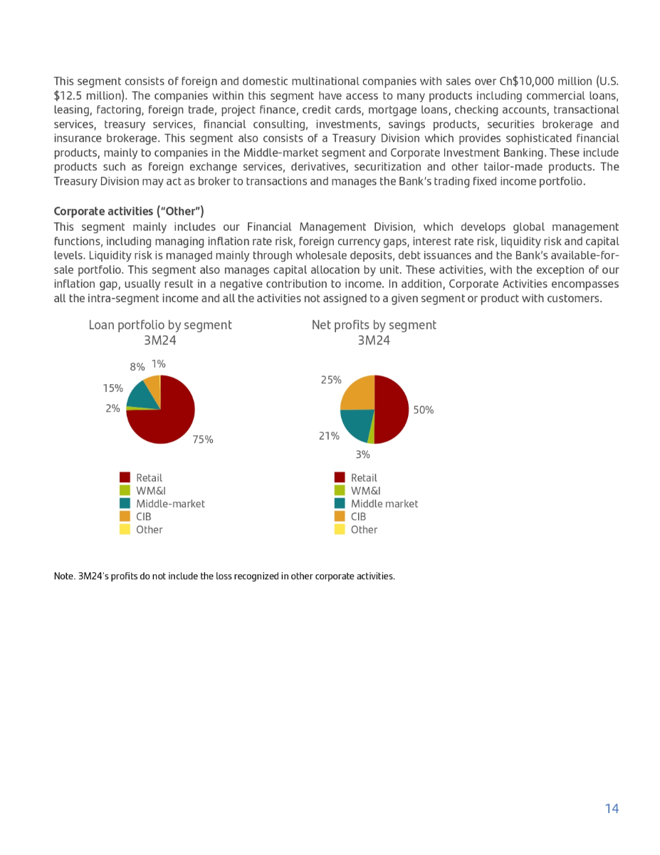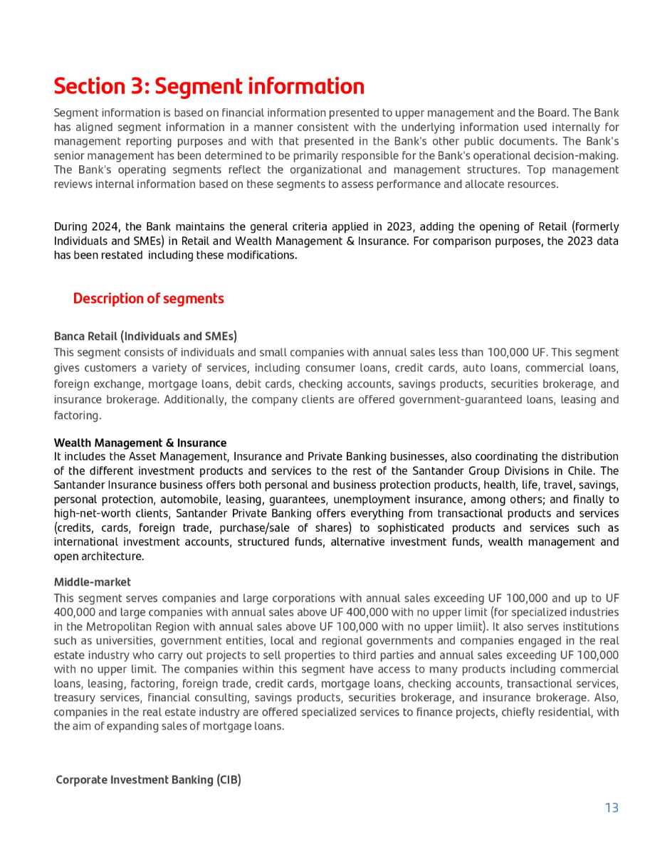 13 S e c t i o n 3:S e g m e n t i n f o r m a t i o n分部信息以提交给高层管理人员和董事会的财务信息为基础。银行以与内部用于管理报告目的的基础信息以及与银行其他公开文件中提供的信息一致的方式对分部信息进行了调整。该行高级管理层已被确定主要负责该行的运营决策。该行的经营分部反映了组织和管理架构。最高管理层根据这些分部审查内部信息,以评估业绩和分配资源。在2024年期间,该行维持2023年适用的一般标准,在零售和财富管理与保险中增加零售(原为个人和中小企业)的开放。为便于比较,已重述2023年数据,包括这些修改。D e s c r i pt i o n of s e g m e n t s b a n c a r e t a i l(i n d i v i d u a l s a n d s m e s)这一细分市场由年销售额低于100,000 UF的个人和小公司组成。该分部为客户提供多种服务,包括消费贷款、信用卡、汽车贷款、商业贷款、外汇、抵押贷款、借记卡、支票账户、储蓄产品、证券经纪和保险经纪。此外,向公司客户提供政府担保贷款、租赁和保理业务。W e a l th m a n a g e m e nt & i n s u r a n c e它包括资产管理、保险和私人银行业务,还协调向智利桑坦德集团其他部门分配不同的投资产品和服务。Santander Insurance业务提供个人和商业保障产品,包括健康、生活、旅行、储蓄、个人保障、汽车、租赁、担保、失业保险等;最后是高净值客户,Santander Private Banking提供从交易产品和服务(信用卡、信用卡、外贸、购买/出售股票)到国际投资账户、结构性基金、另类投资基金、财富管理和开放架构等复杂产品和服务的一切服务。中间市场这一细分市场服务于年销售额超过UF 100,000且最高可达UF 40,000的公司和大公司以及年销售额超过UF 40,000且无上限的大公司(适用于大城市地区年销售额超过UF 100,000且无上限的专业行业)。它还服务于大学、政府实体、地方和地区政府以及从事房地产行业的公司等机构,这些机构开展项目向第三方出售物业且年销售额超过10万用友不设上限。这一细分领域内的公司可以接触到包括商业贷款、租赁、保理、外贸、信用卡、抵押贷款、支票账户、交易服务、资金服务、财务咨询、储蓄产品、证券经纪、保险经纪等众多产品。此外,还向房地产行业的公司提供专门服务,为项目融资,主要是住宅,目的是扩大抵押贷款的销售。C o r p o r a t e i n v e s t m e nt b a n k in g(c IB)