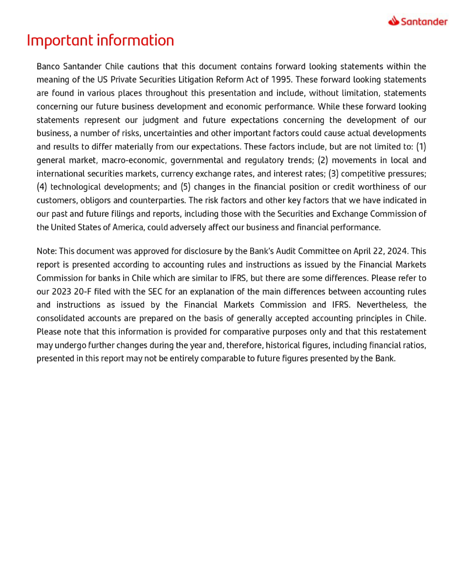 i m p o r t a n t i n f o r m a ti o n 桑坦德银行智利告诫说,本文件包含1995年美国《私人证券诉讼改革法案》含义内的前瞻性陈述。这些前瞻性陈述在本演示文稿的各个地方都有,包括但不限于关于我们未来业务发展和经济表现的陈述。虽然这些前瞻性陈述代表了我们对业务发展的判断和未来预期,但一些风险、不确定性和其他重要因素可能导致实际发展和结果与我们的预期存在重大差异。这些因素包括但不限于:(1)一般市场、宏观经济、政府和监管趋势;(2)当地和国际证券市场、货币汇率和利率的变动;(3)竞争压力;(4)技术发展;(5)我们的客户、债务人和交易对手的财务状况或信用价值的变化。我们在过去和未来的文件和报告中指出的风险因素和其他关键因素,包括那些向美利坚合众国证券交易委员会提交的文件和报告,可能会对我们的业务和财务业绩产生不利影响。注:本文件已于2024年4月22日获本行审核委员会批准披露。本报告根据金融市场委员会为智利境内银行发布的与IFRS类似的会计规则和说明提出,但存在一些差异。请参阅我们向SEC提交的2023 20-F文件,以了解对金融市场委员会发布的会计规则和指令与IFRS之间主要差异的解释。尽管如此,综合账目是根据智利公认的会计原则编制的。请注意,提供这些信息仅用于比较目的,这一重述可能会在年内发生进一步的变化,因此,本报告中提供的历史数字,包括财务比率,可能无法与世界银行提供的未来数字完全可比。