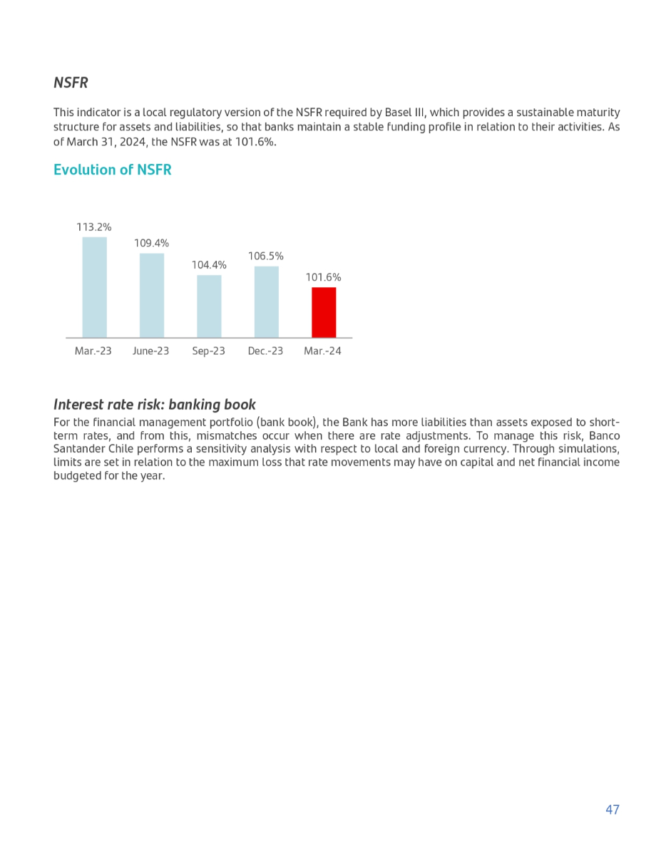 NSFR该指标是巴塞尔协议III要求的地方监管版本的NSFR,它为资产和负债提供了一个可持续的期限结构,从而使银行在其活动方面保持稳定的资金状况。截至2024年3月31日,NSFR为101。6 % .E v o l ut i o n of NS F R 113.2% 109。4 % 47 104 .4 % 106 .5 % 101 .6% m a r。-23 J une-23 S ep-23 d e c。-23m a r。-24 i n t e r e e e e e e e e e e e e e e e e e e e e e e e e e e e e e e e e e e e e e e e e e e e e e e e e e e e e e e e e e e e e e e e e e e e e e e e e e e e e e e e e e e e e e e e e e e e e e e e e e e e e e e e e e e e e e e e e e e e e为了管理这一风险,桑坦德银行智利对本币和外币进行敏感性分析。通过模拟,对利率变动可能对当年预算的资本和净财务收入造成的最大损失设定了限制。