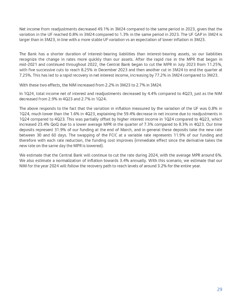 29调整后的净收入减少49。鉴于用友的变化达到0,与2023年同期相比,3M24为1%。与1相比,3m24为8%。2023年同期为3%。3 M 24的用友缺口比3 M 23更大,符合更稳定的用友变化与3 M 23通胀下降的预期。银行有息负债的期限比有息资产短,所以我们的负债比我们的资产更快地认识到利率的变化。在2021年年中开始并持续到2022年的MPR快速上升之后,央行于2023年7月开始从11日开始下调MPR。25%,连续五次下调至8。2023年12月的25%,然后在300万24中再次削减至本季度末的7。25 % .带动净利息收入快速回升,增长77。与3米23相比,3米24为2%。有了这两个影响,净息差从2。3 M 23至2的2%。3m24时7%。1Q 24,扣除利息和调整后的总收入减少4。4%,较4 Q23,正如NIM从2。4 Q23和2的9%。24年第一季度7%。以上是对以下事实的回应:以用友的变化来衡量的通货膨胀的变化为0。24年1季度8%,远低于1季度。4 Q23的6%,解释了59。由于24年第一季度的调整,与23年第四季度相比,净收入下降4%。这部分被24年第一季度的利息收入高于23年第四季度的利息收入所抵消,后者增加了23。环比4%,因7季度平均MPR较低。3%,对比8。23年第4季度3%。我们的定期存款代表31。我们3月底9%的资金,一般这些存款采取新的利率在30到60天之间。以可变利率交换FCIC代表11。我们9%的资金,因此随着每次利率下调,资金成本改善(立即生效,因为衍生品在MPR下调的同一天采取新的利率)。我们估计,央行将在2024年期间继续降息,平均MPR在6%左右。我们还估计通胀正常化接近3。年增长4%。在这种情况下,我们估计2024年的净息差将沿着复苏路径达到3左右的水平。全年2%。