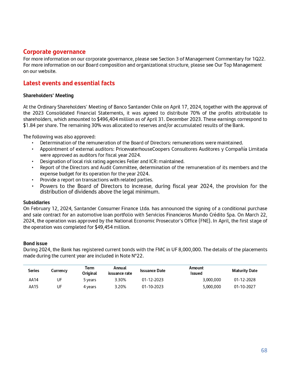 C o r p o r a t e g o v e r n a n c e有关我们公司治理的更多信息,请参阅22年第一季度管理层评论的第3节。有关我们董事会组成和组织结构的更多信息,请在我们的网站上查看我们的最高管理层。L a t e s t e v e nt s a n d e ss e nt i a l fa c t s h a r e h o l d e r s ' m ee tin g在2024年4月17日举行的桑坦德银行智利普通股东大会上,连同2023年度合并财务报表的批准,同意分配股东应占利润的70%,截至4月31日为4.96-4.04亿美元。2023年12月。这些收益对应1美元。每股84。其余30%分配给准备金和/或银行的累积结果。T h e f o ll o w i ng w a s a l so a pp ro v e d:•董事会薪酬的确定:薪酬保持不变。•任命外部审计员:普华永道咨询公司审计员y Compa ñ í a Limitada被批准为2024财年审计员。•指定当地风险评级机构Feller和ICR:维持。•董事和审计委员会的报告,确定其成员的薪酬和2024年运营的费用预算。•提供与关联方交易的报告。•授权董事会在2024财政年度增加高于法定最低限度的股息分配准备金。子公司2024年2月12日,Santander Consumer Finance Ltda.宣布与Servicios Financieros Mundo Cr é dito Spa签署汽车贷款组合的有条件买卖合同。2024年3月22日,该行动获得国家经济检察院(FNE)批准。4月,该行动的第一阶段以4.9亿美元、4.54亿美元的价格完成。B o n d i ss u e 2024年期间,本行已在FMC登记的流动债券为8,000,000瑞士法郎。有关于本年度进行的配售的详情载于附注N丨22。S e e e e e e e e e e e e e e e e e e e e e e e e e e e e e e e e e e e e e e e e e e e e e e e e e e e e e e e e e e e e e e e e e e e e e e e e e e e e e e e e e e e e e e e e e e e e e e e e e e e e e e e e e e e e e e e e e e e e e e e e e e e e e e e e e e e e e e e e e e e e e e e e e e e e e e e e e e e e e e e e e e e e e e e e e e e e e e e e e e e e e e e e e e e e e e e e e e e