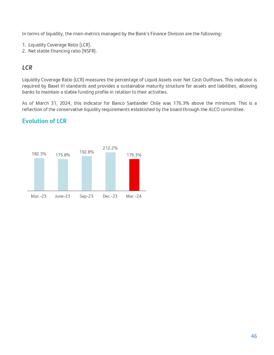 在流动性方面,该行财务部门管理的主要指标如下:1。L i qu i d it y c o v e r a g e r a ti o(LC R)。2.N e t s t a b l e f i n a n c i ng r a ti o(n s f r)。LCR流动性覆盖率(LCR)衡量流动性资产占净现金流出的百分比。这一指标是巴塞尔协议III标准所要求的,为资产和负债提供了一个可持续的期限结构,使银行能够保持与其活动相关的稳定资金状况。截至2024年3月31日,桑坦德银行智利的这一指标为176。高于最低3%。这反映了董事会通过ALCO委员会确立的保守的流动性要求。L C R 182的E v o l ut i o n。3 % 46 175 .8 % 192 .8 % 212 .2 % 176 .3% m a r。-23 J une-23 S ep-23 d e c。-23m a r。- 24