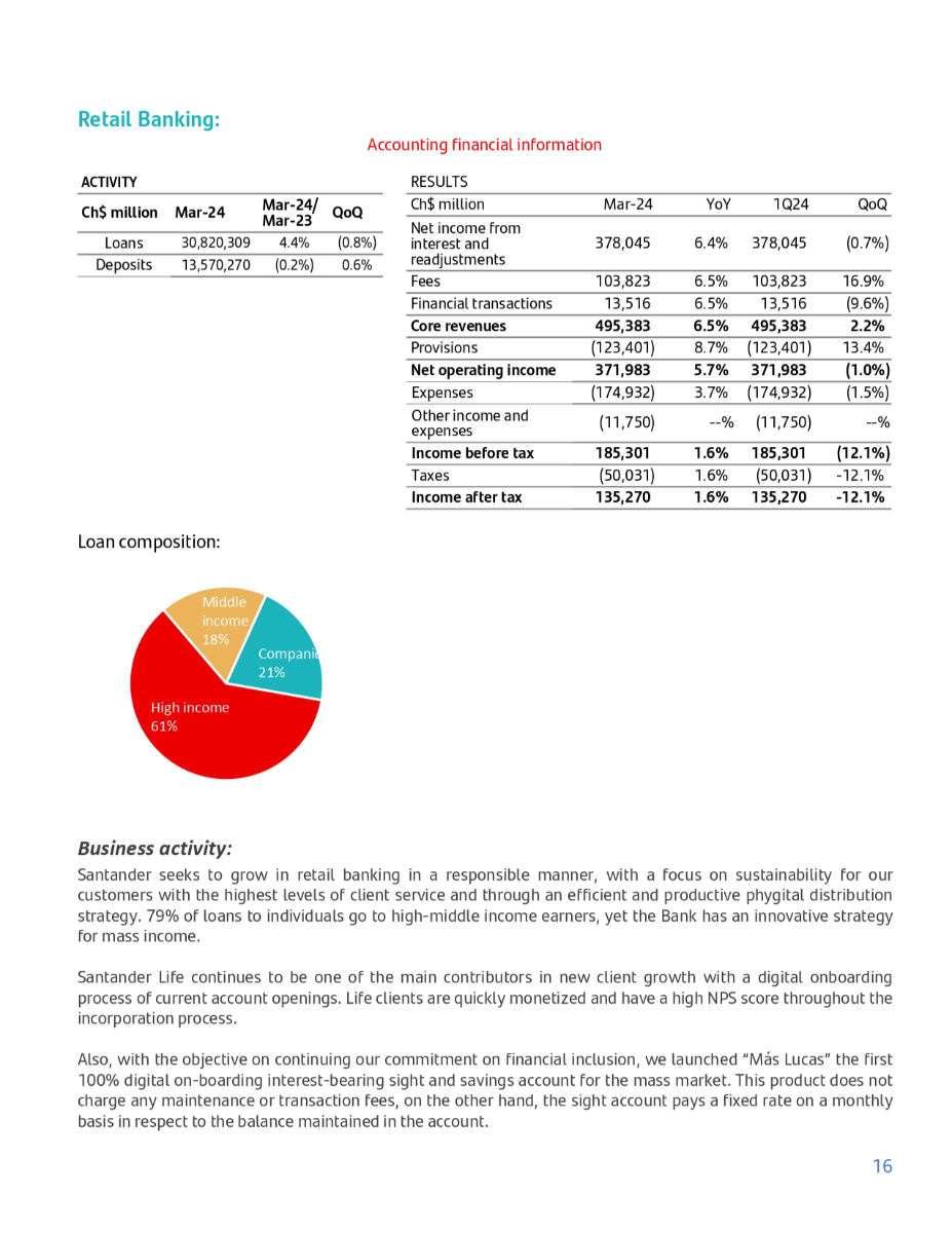 R e t a i l b a n k i n g:a c t i v i t y m a r-24/mar-23 c h $ m i ll i o n m a r-24 q o q贷款d ep o s it s 30,820,30913,570,2704.4%(0。2 % ) ( 0 .8%)0.6% A CC o un ti ng f i n a n c i a l i n f or m a ti o n results c h $ mi ll i o n m a r-24 y o y 1 q 24 q o q e x pen s e s(0.7%)378,0456.4% 378,045利息净收入及调整16.9% 103,8236.5% 103,823费用(9.6%)13,5166.5% 13,516金融交易2.2% 495,3836.5% 495,383核心收入13.4%(123,401)8.7%(123,401)拨备(1.0%)371,9835.7% 371,983净营业收入(1.5%)(174,932)3.7%(174,932)费用--%(11,750)--%(11,750)其他收入和(12.1%)185,3011.6% 185,301税前收入-12.1%(50,031)1.6%(50,031)税项-12.1% 135,2701.6% 135,270税后收入L o a n c o m p os i t i o n:middle in c o me 18% Companie 21% H i gh in c o me 61% 16商业活动:桑坦德银行寻求以负责任的方式在零售银行业务中实现增长,重点是通过最高水平的客户服务和高效和富有成效的phygital分销战略为我们的客户提供可持续性。79%的个人贷款流向高中收入者,但该行有一项面向大众收入的创新战略。Santander Life继续通过当前开户的数字化入职流程,成为新客户增长的主要贡献者之一。生活客户的变现速度很快,并且在整个注册过程中都有很高的NPS分数。此外,以继续我们对金融普惠的承诺为目标,我们推出了“M á s Lucas”,这是第一个面向大众市场的100%数字化登机计息视力和储蓄账户。该产品不收取任何维护或交易费用,另一方面,即期账户就账户内保持的余额按月支付固定费率。