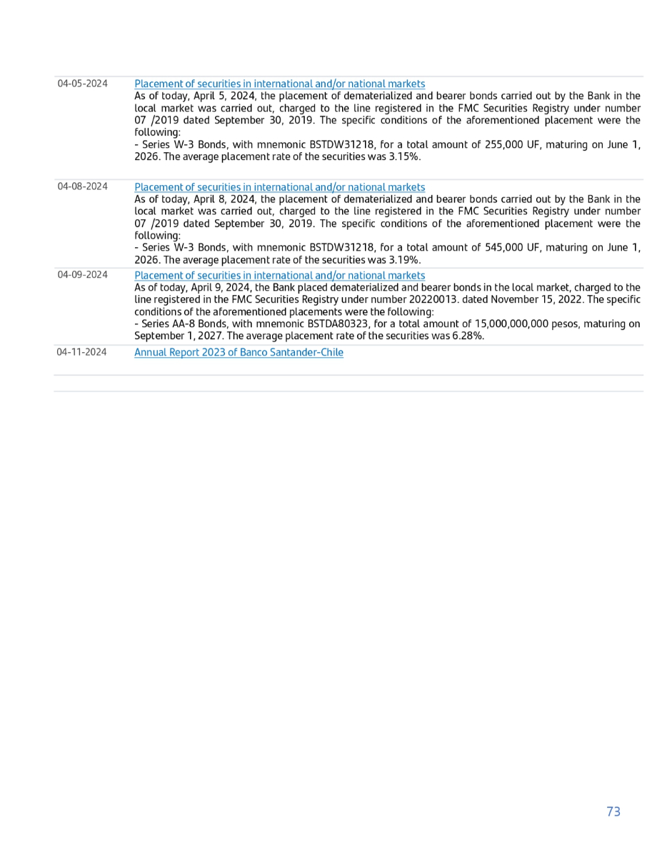 04-05-2024年P L A C E M en t o f s e c u r iti e s i n i n t e r n a ti o n a l a nd/or n a ti o n a l m a r k e t s截至今天2024年4月5日,本行在当地市场开展的非物质化和无记名债券的投放,于2019年9月30日在FMC证券注册处根据编号07/2019登记的线路收费。上述配售的具体条件如下:-W-3系列债券,采用助记符BSTDW 31218,总额为25.5万UF,将于2026年6月1日到期。证券的平均配售率为3。15 % .04-08-2024 04-09-2024 P l a c e m en t o f s e c u r iti e s i n i n t e r n a ti o n a l a nd/or n a ti o n a l m a r k e s截至今日,2024年4月8日,本行在当地市场开展的非物质化和无记名债券的配售,于2019年9月30日在FMC证券注册处根据编号07/2019登记的线路收费。上述配售的具体条件如下:-W-3系列债券,助记符BSTDW 31218,总金额54.5万用友,2026年6月1日到期。证券的平均配售率为3。19 % .P l a c e m en t o f s e c u r iti e s i n i n t e r n a ti o n a l a nd/or n a ti o n a l m a r k e t s 04-11-2024截至2024年4月9日,本行在当地市场投放非实物化和不记名债券,记入2022年11月15日在FMC证券登记处登记的编号为20220013的额度。具体c o nd iti o n s o f t he a f或e m en ti o ned p l a c e m en t s w e r e e e e e e e e e e e e e e e e e e e e e e e e e e e e e e e e e e e e e e e e e e e e e e e e e e e e e e e e e e e e e e e e e e e e e e e e e e e e e e e e e e e e e e e e e e e e e e e e e e e e e e e e e e e e e e e e e e e e e e e e e e e证券平均配售率为6。28 % .桑坦德银行-智利73银行2023年年度报告