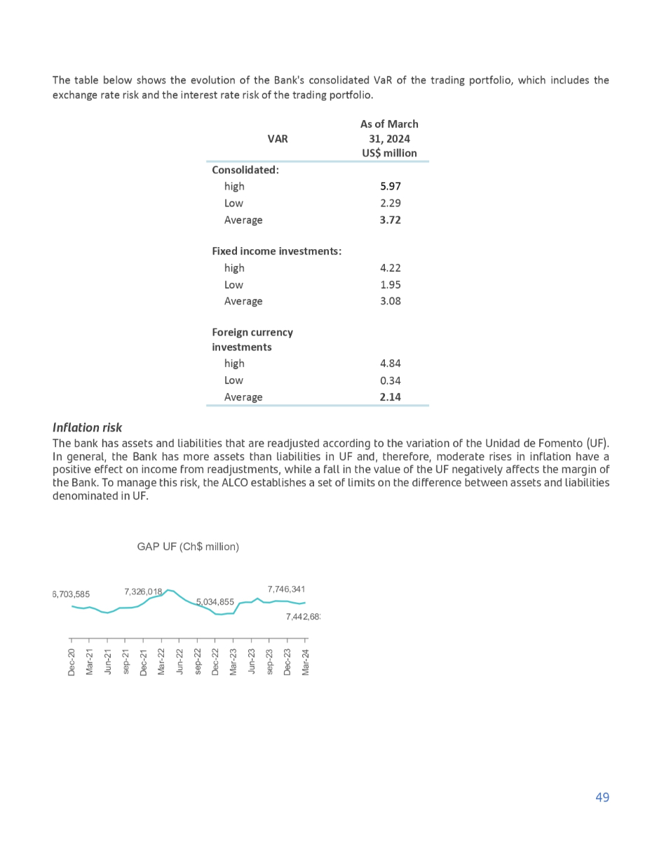 下表显示了交易组合的银行合并VaR的演变,其中包括交易组合的汇率风险和利率风险。V AR截至2024年3月31日百万美元合并:高低A V时代g e 5。97 2 .29 3 .72固定收益投资:4.22高1.95低3.08平均外币投资4.84高0.34低2.14平均i n f l a t i o n r i s k银行有资产和负债,根据投资组合(UF)的变化重新调整。总体而言,该行在金融同业拆借中的资产多于负债,因此,通胀温和上升对调整后的收入产生积极影响,而金融同业拆借价值下跌则对银行的利润率产生负面影响。为了管理这种风险,ALCO对以用友网络计价的资产与负债之间的差额建立了一套限制。GAP UF(CH $ million)496,703,5857,326,0185,034,8557,746,3417,442,68 de c-2 0 mar-2 1 J un-2 1 s ep-2 1 dec-21 mar-2 2 2 Jun-22 sep-22 de c-2 mar-2 3 J un-2 3 s ep-23 de c-2 3 mar-2 4