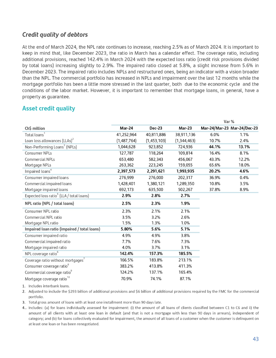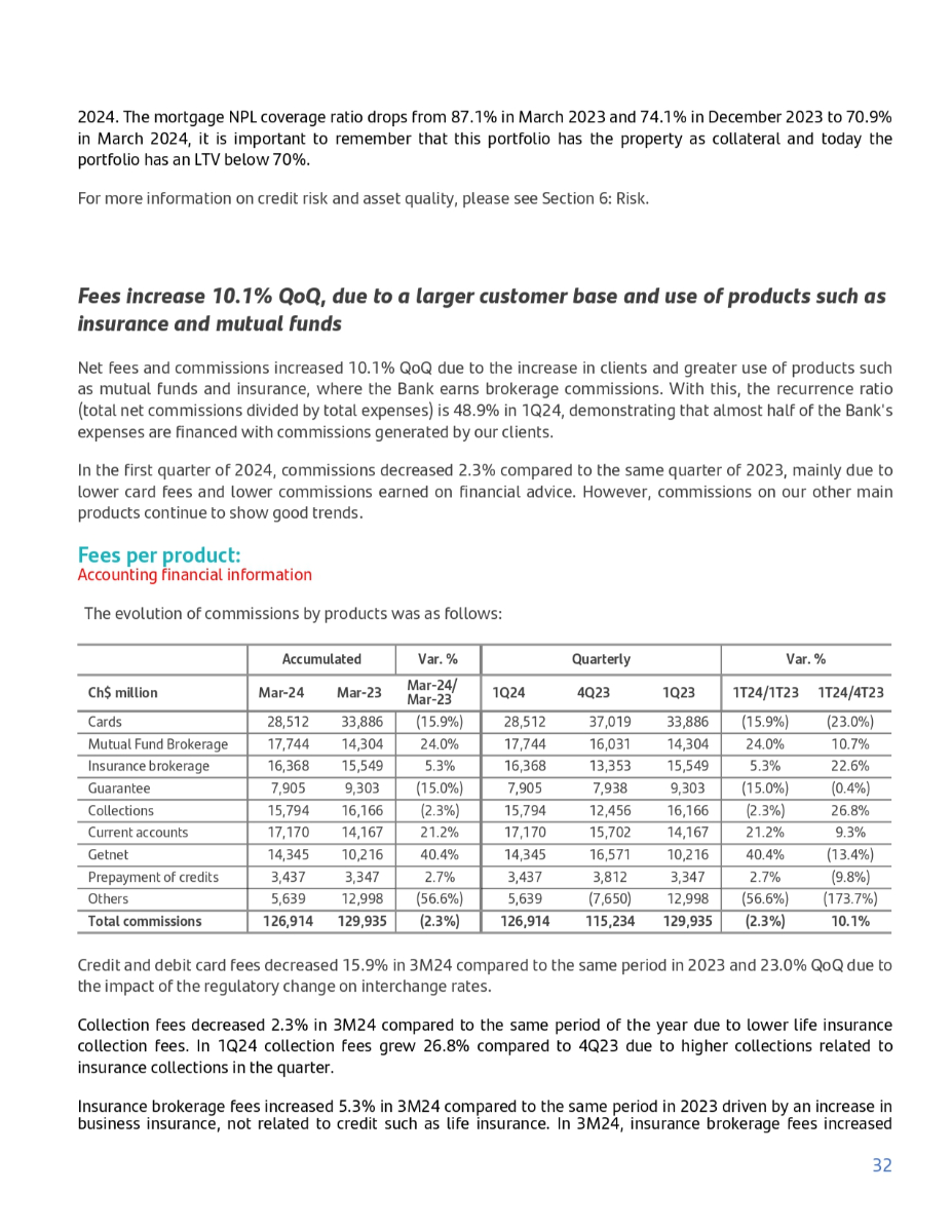 32 2024 .房贷不良贷款覆盖率从87。2023年3月的1%和74。2023年12月为1%,降至70。2024年3月的9%,重要的是要记住,这个投资组合有物业作为抵押品,而今天这个投资组合的LTV低于70%。更多关于信用风险和资产质量的信息,请看第六节:风险。收费增加10。环比1%,因客户基础扩大,使用保险、共同基金等产品净手续费及佣金增加10。环比增长1%,原因是客户增加,以及更多地使用共同基金和保险等产品,该行在这些领域赚取券商佣金。这样,重复比率(总净佣金除以总费用)为48。24年第一季度9%,表明银行几乎一半的开支是由我们的客户产生的佣金提供的。2024年第一季度,佣金减少了2。与2023年同季度相比3%,主要是由于较低的卡费和较低的财务建议所赚取的佣金。然而,我们其他主要产品的佣金继续呈现良好趋势。F ee s p e r p r o d u c t:a cc o un ti ng f i n a n c i a l i n f或m a ti o n t h e e v o l u ti o n o f c o mmi ss i o n s by p ro du c t s w a s a s a s a s f o ll o w s:var。%季度变量。累计% 1T24/4T23 1T24/1T23 1Q23 4Q23 1Q24 Mar-24/Mar-23 Mar-23 Mar-24 CH $百万(23.0%)(15.9%)33,88637,01928,512(15.9%)33,88628,512卡10.7% 24.0% 14,30416,03117,74424.0% 14,30417,744共同基金经纪22.6% 5.3% 15,54913,35316,3685.3% 15,54916,368保险经纪(0.4%)(15.0%)9,3037,9387,905(15.0%)9,3037,905担保26.8%(2.3%)16,16612,45615,794(2.3%)16,16615,794收款9.3% 21.2% 14,167(173.7%)(56.6%)12,998(7,650)5,639(56.6%)12,9985,639其他10.1%(2.3%)129,935115,234126,914(2.3%)129,935126,914总佣金信用卡和借记卡手续费下降15。与2023年和23年同期相比,3M24为9%。环比0%因监管变化对换乘费率的影响。征收费用下降2。3m24同比3%,因寿险代收手续费较低。1季度24收费增长26。与4 Q23相比增长8%,原因是本季度与保险收款相关的收款增加。保险经纪手续费上涨5。3M24较2023年同期3%受业务保险增加带动,与寿险等信贷无关。3M24,保险经纪手续费上涨