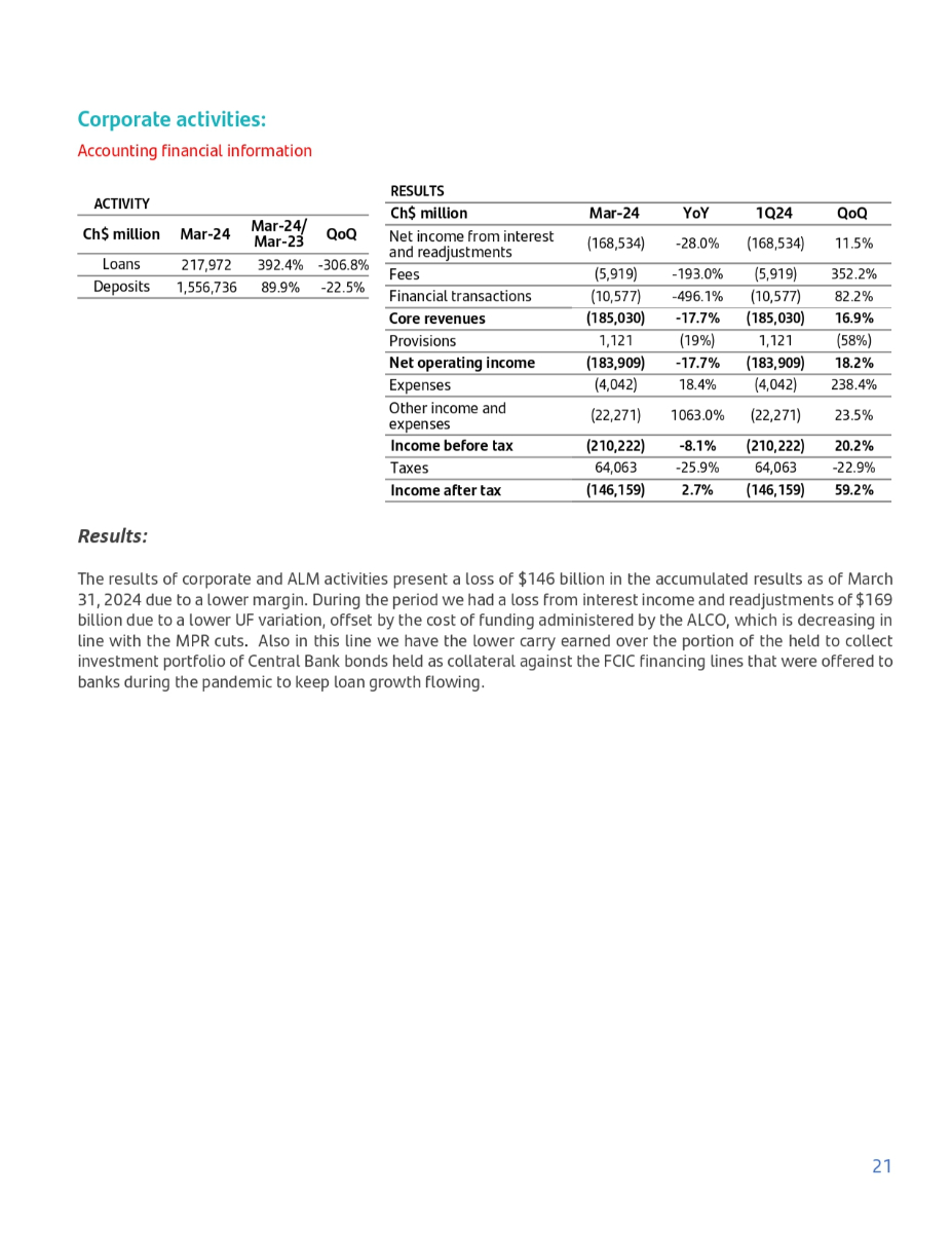 C o r p o r a t e a c t i v i t i e s:a cc o un ti ng f i n a n c i a l i n f or m a ti o n activity m a r-24/mar-23 c h $ m i ll i o n m a r-24 q o q q l o a n s 217,972392.4%-306.8% d ep o s it s 1,556,73689。9 % - 22 .业绩环比5% 1Q24 YoY Mar-24CH $百万11.5%(168,534)-28.0%(168,534)利息和调整净收入21 e x pen s e s 352.2%(5,919)-193.0%(5,919)费用82.2%(10,577)-496.1%(10,577)金融交易16.9%(185,030)-17.7%(185,030)核心收入(58%)1,121(19%)1,121拨备18.2%(183,909)-17.7%(183,909)净营业收入238.4%(4,042)18.4%(4,042)费用23.5%(22,271)1063.0%(22,271)其他收入和20.2%(210,222)-8.1%(210,222)税前收入-22.9% 64,063-25.9% 64,063税项59.2%(146,159)2.7%(146,159)税后收入结果:公司和ALM活动的结果显示,由于利润率较低,截至2024年3月31日的累计结果中亏损1460亿美元。在此期间,由于较低的用友变动,我们的利息收入和调整造成了1690亿美元的亏损,但被ALCO管理的融资成本所抵消,该成本正在随着MPR削减而下降。同样在这一行中,我们获得的利差低于所持有的用于收集作为抵押品的中央银行债券投资组合的部分,这些债券是在大流行期间提供给银行以保持贷款增长的FCIC融资额度的。
