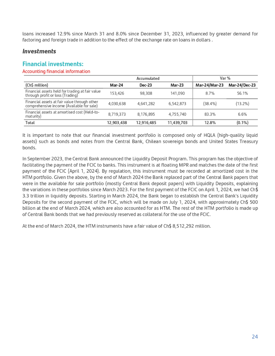 24项贷款自3月31日以来增长12.9%,自2023年12月31日以来增长8.0%,除了汇率对美元贷款的影响外,还受到保理和外贸需求增加的影响。投资F i n a n c i a l i n v e s t m e nt s:A CC o un ti ng f i n a n c i a l i n f or m a ti o n var %累计3月24日/12月23日-3月24日/3月23日-12月23日-3月24日(百万加元)56.1% 8.7% 141,09098,308153,426持有金融资产以公允价值计量且其变动计入损益的金融资产(交易)(13.2%)(38.4%)6,542,8734,641,2824,030,638以公允价值计量且其变动计入其他综合收益的金融资产(可供出售)6.6% 83.3% 4,755,7408,176,8958,719,373以摊余成本计量的金融资产(持有-到期)(0.1%)12.8% 11,439,70312,916,48512,903,438合计值得注意的是,我们的金融投资组合仅由HQLA(高质量流动资产)组成,例如来自中央银行的债券和票据、智利主权债券和美国国债。2023年9月,央行公布流动性存款方案。该计划的目标是便利FCIC向银行付款。该工具为浮动MPR,与FCIC首次缴款日期(2024年4月1日)相匹配。根据规定,这一工具必须在HTM投资组合中以摊余成本入账。鉴于上述情况,到2024年3月底,该行将可供出售投资组合中的部分央行票据(主要是央行存款票据)替换为流动性存款,解释了自2023年3月以来这些投资组合的变化。对于2024年4月1日FCIC的首次付款,我们有3新台币。3万亿流动性存款。从2024年3月开始,该行开始为FCIC的第二次支付建立央行流动性存款,将于2024年7月1日进行,2024年3月底约为5000亿瑞士法郎,也作为HTM入账。HTM投资组合的其余部分由我们之前为使用FCIC保留作为抵押品的央行债券组成。截至2024年3月底,HTM工具的公允价值为8、5.12、2.92亿瑞士法郎。