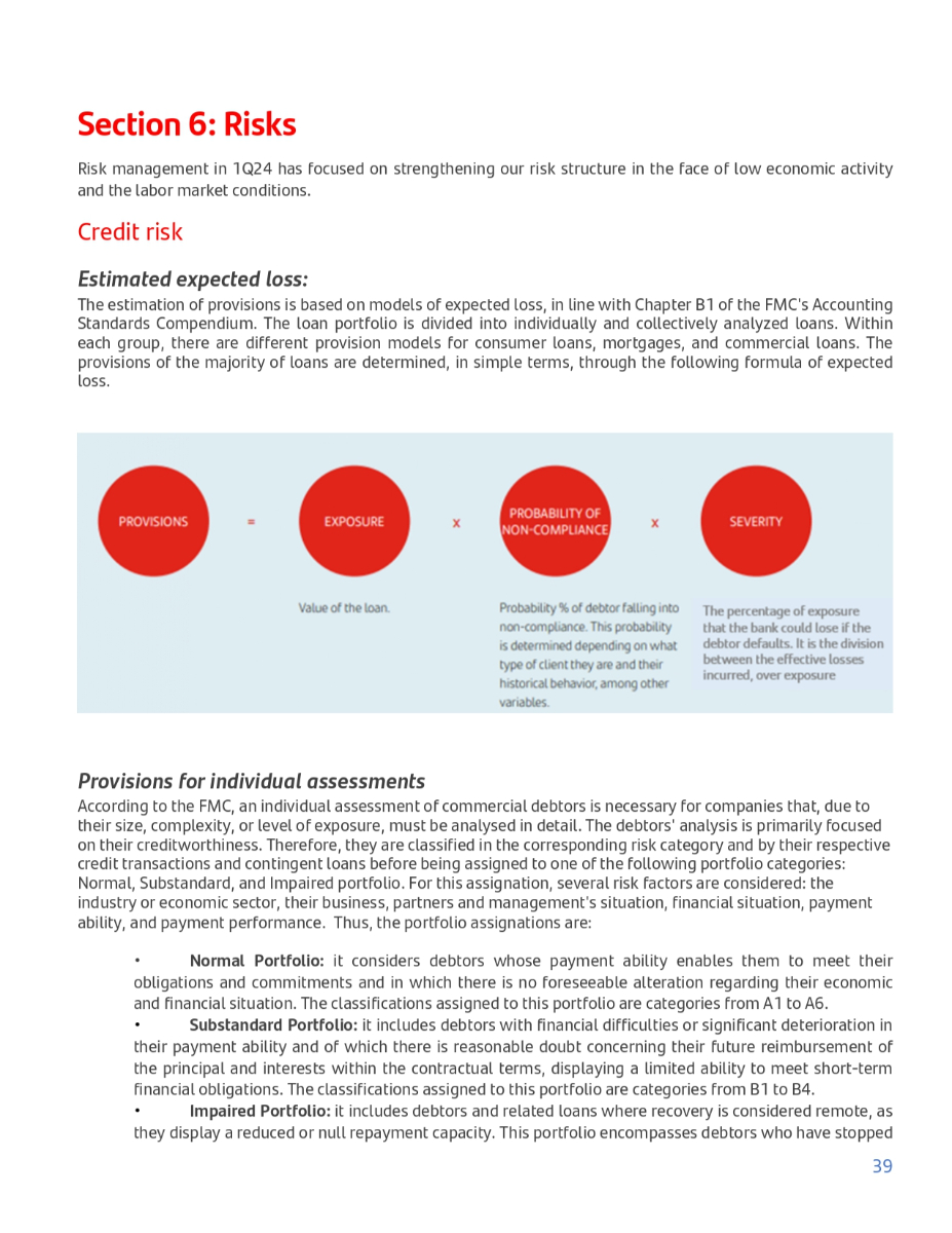 S e c t i o n 6:R i s k s风险管理在1 q24中重点加强了我们面对低经济活动和劳动力市场条件的风险结构。C R e d it r i sk e s t i m a t e d e x p e c t e d l o ss:拨备的估计基于预期损失的模型,符合《FMC会计准则汇编B1章》。贷款组合分为个别分析贷款和集体分析贷款。在每一组内部,消费贷款、抵押贷款、商业贷款都有不同的拨备模式。大部分贷款的拨备,简单来说,是通过以下的预期损失公式确定的。个别评估的规定根据FMC,对于由于规模、复杂性或风险暴露程度而必须进行详细分析的公司,有必要对商业债务人进行个别评估。债务人的分析主要集中在他们的信誉上。因此,在被分配到以下投资组合类别之一之前,它们被归类在相应的风险类别中,并根据各自的信用交易和或有贷款进行分类:正常、次级和减值投资组合。对于这一转让,考虑了几个风险因素:行业或经济部门、其业务、合作伙伴和管理层的情况、财务状况、支付能力、支付绩效。因此,投资组合转让是:•正常投资组合:它考虑的是债务人的支付能力使其能够履行其义务和承诺,并且在其中其经济和金融状况没有可预见的变化。分配给这个投资组合的分类是从A1到A6的类别。•低于标准的投资组合:包括财务困难或支付能力显著恶化的债务人,对其未来在合同条款范围内偿还本金和利息存在合理怀疑,显示出满足短期财务义务的能力有限。分配给这个投资组合的分类是从B1到B4的类别。•受损的投资组合:它包括债务人和相关贷款,因为它们显示出减少或无效的偿还能力,而追偿被认为是遥远的。这一投资组合包括已停止39