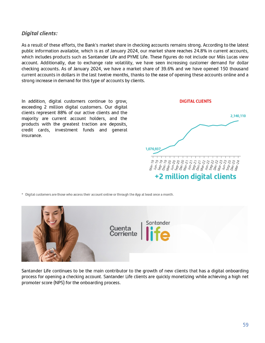 数字客户端:由于这些努力,银行在支票账户的市场份额保持强劲。根据可获得的最新公开信息,也就是截至2024年1月,我们的市场份额达到24。活期账户8%,其中包括Santander Life和PYME Life等产品。这些数字不包括我们的M á s Lucas view帐户。此外,由于汇率波动,我们看到客户对美元支票账户的需求不断增加。截至2024年1月,我们的市场份额为39。6%,而我们在过去十二个月中以美元开立了15万个活期账户,这要归功于在线开立这些账户的便利性以及客户对这类账户需求的强劲增长。此外,数字化客户持续增长,超过200万数字化客户。我们的数字客户代表了88%的活跃客户,大多数是活期账户持有人,而最具吸引力的产品是存款、信用卡、投资基金和一般保险。+ 2 m i ll i o n d i g i t a l c l i e n t s d i g i t a l c l i e n t s d i g i t a l c l i e n t s d i g i t a l c l c l i e n t s 1,076,9372,140,110 *数字客户是指每月至少一次在线或通过应用程序访问其账户的客户。Santander Life继续成为开设支票账户的数字化入职流程的新客户增长的主要贡献者。Santander Life客户正在快速变现,同时实现了入职流程的高净推荐值(NPS)。59