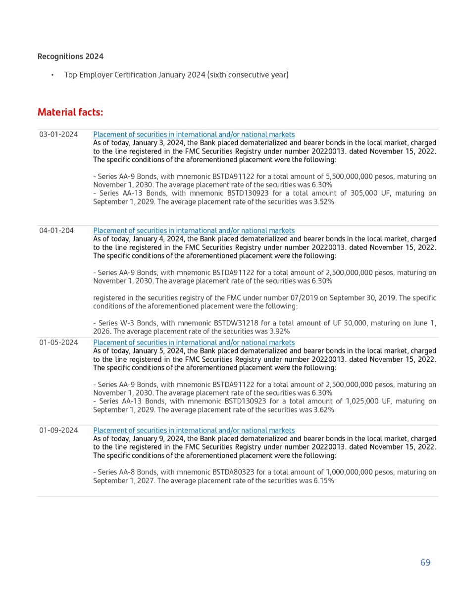 R e c o g niti o n s 2024 •最佳雇主认证2024年1月(连续第六年)m a t e r i a l fa c t s:03-01-2024 p l a c e m en t o f s e c u r iti e s i n i n t e r n a ti o n a l a nd/or n a ti o n a l m a r k t s截至今天,2024年1月3日,该银行在当地市场投放非物质化和无记名债券,记入2022年11月15日在FMC证券登记处登记的编号为20220013。的额度。T he s pe c i f i c c o nd iti o n s o f t he a f or e m en ti o ned p l a c e m en t w e r e t he f o ll o w i ng:-系列AA-9债券,助记符BSTDA91122,总金额为5,500,000,000比索,于2030年11月1日到期。证券的平均配售率为6。30%-系列AA-13债券,助记符BSTD 130923总金额30.5万UF,2029年9月1日到期。证券的平均配售率为3。52% 04-01-204 01-05-2024 P L A C E M en T O F S E C U R ITE E S i n i n i n t e r n a ti o n a l a nd/or n a ti o n a l m a r k e t s截至今日,2024年1月4日,本行在当地市场投放非物质化和无记名债券,于2022年11月15日在FMC证券登记处注册,编号为20220013。T he s pe c i f i f i c c o nd iti o n s o f t he a f or e m en ti o ned p l a c e m en t w e r e t he f o ll o w i ng:-AA-9系列债券,助记符BSTDA91122,总金额为2,500,000,000比索,于2030年11月1日到期。证券的平均配售率为6。30%于2019年9月30日在FMC证券登记处登记,编号为07/2019。具体c o nd iti o n s o f t he a f或e m en ti o ned p l a c e m en t w e r e e e e e e e e e e e e e e e e e e e e e e e e e e e e e e e e e e e e e e e e e e e e e e e e e e e e e e e e e e e e e e e e e e e e e e e e e e e e e e e e e e e e e e e e e e e e e e e e e e e e e e e e e e e e e e e e e e e e e e e e e e e e e e证券的平均配售率为3。92% P l a c e m en t o f s e c u r iti e s i n i n t e r n a ti o n a l a nd/or n a ti o n a l a nd/or n a ti o n a l m a r k e t s截至今天,即2024年1月5日,本行在本地市场配售非实质化和不记名债券,记入2022年11月15日在FMC证券登记处登记的编号为20220013的额度。T he s pe c i f i c c o nd iti o n s o f t he a f or e m en ti o ned p l a c e m en t w e r e e he f o ll o w i ng:-系列AA-9债券,助记符BSTDA91122,总金额为2,500,000,000比索,于2030年11月1日到期。证券的平均配售率为6。30%-系列AA-13债券,助记符BSTD 130923总金额1025000 UF,2029年9月1日到期。证券的平均配售率为3。62% 01-09-2024 P L A C E M T O F S E C U R ITE E S I N I N T E R N A TI O N A L A ND/or N A TI O N A L A ND/or N A TI O N A L M A R K E T S截至今日(2024年1月9日),本行于本地市场配售非实质化及不记名债券,记入2022年11月15日在FMC证券登记处登记的编号为20220013的额度。T he s pe c i f i c c o nd iti o n s o f t he a f or e m en ti o ned p l a c e m en t w e r e e he f o ll o w i ng:-系列AA-8债券,助记符BSTDA80323,总金额为1,000,000比索,于2027年9月1日到期。证券的平均配售率为6。15 % 69