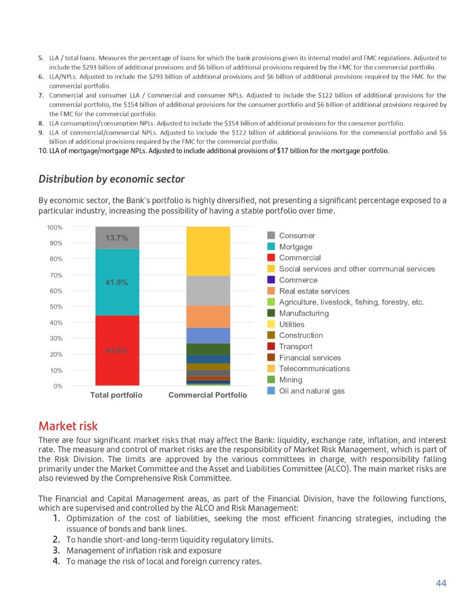 13.7% 41.9% 44.5% Consumer Mortgage Co mm e rc ia l社会服务和其他公共服务商业房地产服务农业、畜牧业、渔业、林业等制造业公用事业建筑运输金融服务T ele c o mm uni c a t ion s矿业石油和天然气5。LLA/贷款总额。衡量银行为其提供内部模型和FMC规定的贷款拨备的百分比。调整后包括2930亿美元的额外准备金以及FMC为商业投资组合要求的60亿美元额外准备金。6.LLA/NPLs。调整后包括2930亿美元的额外准备金以及FMC为商业投资组合要求的60亿美元额外准备金。7.商业和消费者LLA/商业和消费者不良贷款。调整后包括商业投资组合的1220亿美元额外准备金、消费者投资组合的1540亿美元额外准备金以及FMC要求的商业投资组合的60亿美元额外准备金。8.LLA消费/消费不良贷款。调整后包括1540亿美元的消费者投资组合额外准备金。9.商业/商业不良贷款的LLA。调整后包括商业投资组合的1220亿美元额外拨备和FMC商业投资组合所需的60亿美元额外拨备。10.抵押/抵押贷款不良贷款的LLA。调整后包括170亿美元的抵押贷款组合额外准备金。D i s tr i b u t i o n b y e e c o n m i c s e c t o r按经济部门划分,该行的投资组合高度多样化,没有呈现对特定行业的显着百分比敞口,增加了随着时间推移拥有稳定投资组合的可能性。100%总投资组合44商业投资组合0% 10% 20% 30% 40% 50% 60% 70% 80% 90% M a r k e t r i sk有四个显著的市场风险可能影响银行:流动性、汇率、通货膨胀和利率。市场风险的度量和控制由市场风险管理负责,属于风险司的一部分。这些限额由负责的各个委员会批准,其责任主要属于市场委员会和资产负债委员会(ALCO)。主要市场风险也由综合风险委员会审查。财务和资本管理领域作为财务司的一部分,具有以下职能,由ALCO和风险管理部门监督和控制:1。负债成本优化,寻求最有效的融资策略,包括i ss u a n c e o f b o n d s a nd b a n k l i n e s。2.处理好短期和长期流动性监管限额。3.M a n a g e m e n t o f i n f l a ti o n r i s k a nd e x p os u r e 4。管理本外币汇率风险。