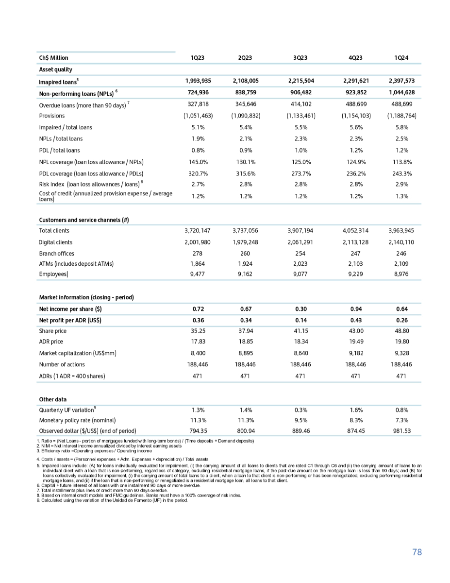 78 l o an an s)1Q24 4Q23 3Q23 2Q23 1Q23 CH $百万A SS e t q uality 2,397,5732,291,6212,215,5042,108,0051,993,935 IMA p ir e d loan s 51,044,628923,852906,482838,759724,936 non-PE rforming loans(NPLs)6488,699488,699414,102345,646327,818 Overd u e l o a n s(m o re th an 90 days)7(1,188,764)(1,154,103)(1,133,461)(1,090,832)(1,051,463)拨备5.8%o A n s 1.2% 1.2% 1.0% 0.9% 0.8% P DL/tot al l o a n s 113.8% 124.9% 125.0% 130.1% 145.0% N P L c o average(l o an l o ss all o wa n ce/n P L)243.3% 236.2% 273.7% 315.6% 32 0.7% PDL覆盖率(贷款损失准备/PDL)2.9% 2.8% 2.8% 2.7%风险指数(贷款损失准备/贷款)81.3% 1.2% 1.2% 1.2% 1.2%信贷成本(年化拨备费用/平均自和s e rvi c e c hann e ls(#)3,963,9454,052,3143,907,1943,737,0563,720,147 t ot al clie nt s 2,140,1102,113,1282,061,2911,979,2482,001,980 Digi t al clie nt s 246247254260278 bra n ch o offices 2,1092,1032,0 231,9241,864 ATM(i n cl u des de po sit ATM)8,9769,2299,0779,1629,477 Employees | Market Information(closing-period)0.64 0.94 0.30 0.67 0.72 N e t in c ome pe r sh(美元)48.80 43.00 41.15 37.94 35.25 s h是p米19.80 19.49 18.34 18.85 17.83 ADR p米9,3289,1828,6408,8958,400市场ca p i t aliza t i o n(US $ mm)188,446188,446188,446188,446188,446 N u m b er o f ac t i on s 471471471 ADR(1 ADR = 400 s h ares)Oth e r data 0.8% 1.6% 0.3% 1.4% 1.3% Q u ar t erly UF varia t i on 97.3% 8.3% 9.5% 11.3% 11.3% M on e t ary po licy rat e(no mi n al)981.53874.45889.46800.94794.35 o b served d o llar($/US $)(e n d o f p eri o d)1。比率=(贷款净额-以长期债券融资的按揭部分)/(定期存款+活期存款)2。NIM =年化净利息收入除以生息资产3。效率比=营业费用/营业收入4。成本/资产=(人员+ Adm.费用+折旧)/资产总额5。减值贷款包括:(a)就个别评估减值的贷款而言,(i)评级为C1至C6的所有贷款予客户的账面值;及(ii)如按揭贷款的逾期金额少于90天,则向个别客户提供的贷款不论类别均属不良贷款的账面值,不包括住宅按揭贷款;及(b)就集体评估减值的贷款而言,(i)向客户提供的贷款总额的账面值,当向该客户提供的贷款为不良贷款或已重新谈判时,不包括正在履行的住宅抵押贷款,以及(ii)如果不良贷款或重新谈判的贷款为住宅抵押贷款,则向该客户提供的所有贷款。6.本金+逾期一期90天或以上的所有贷款的未来利息。7.总分期付款加上信用额度逾期90天以上。8.基于内部信用模型和FMC指引。银行必须有100%的风险指数覆盖率。9.使用Unidad de Fomento(UF)在该期间的变化计算得出。