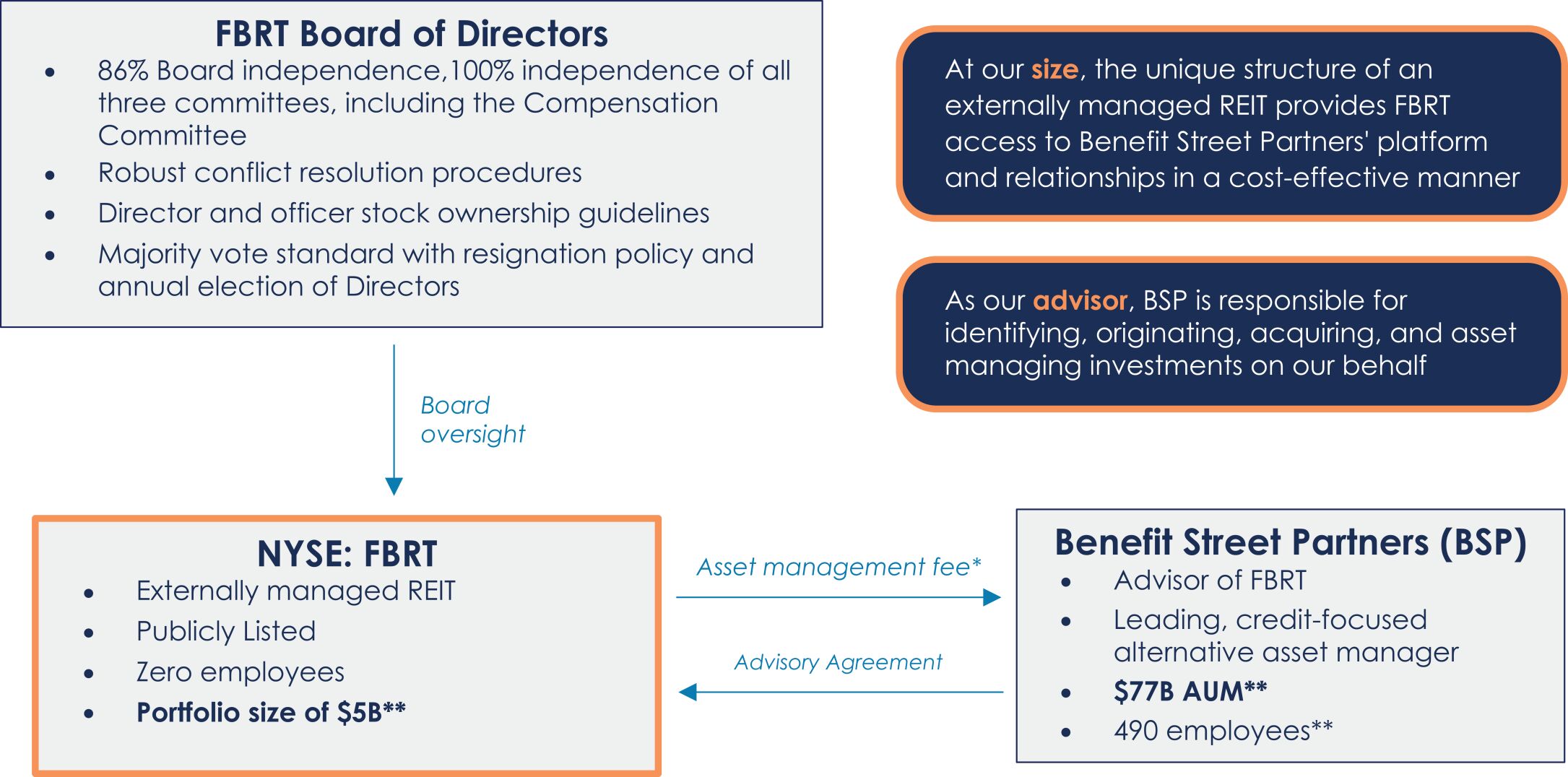 我们董事会的作用是监督我们纪律严明的战略的执行,并保护我们的股东的权利。我们已提名所有七名现任董事在年会上连任,其中86%是独立董事。FBRT通过与我们的股东积极互动并对我们收到的任何反馈做出回应,定期评估和加强其治理实践。