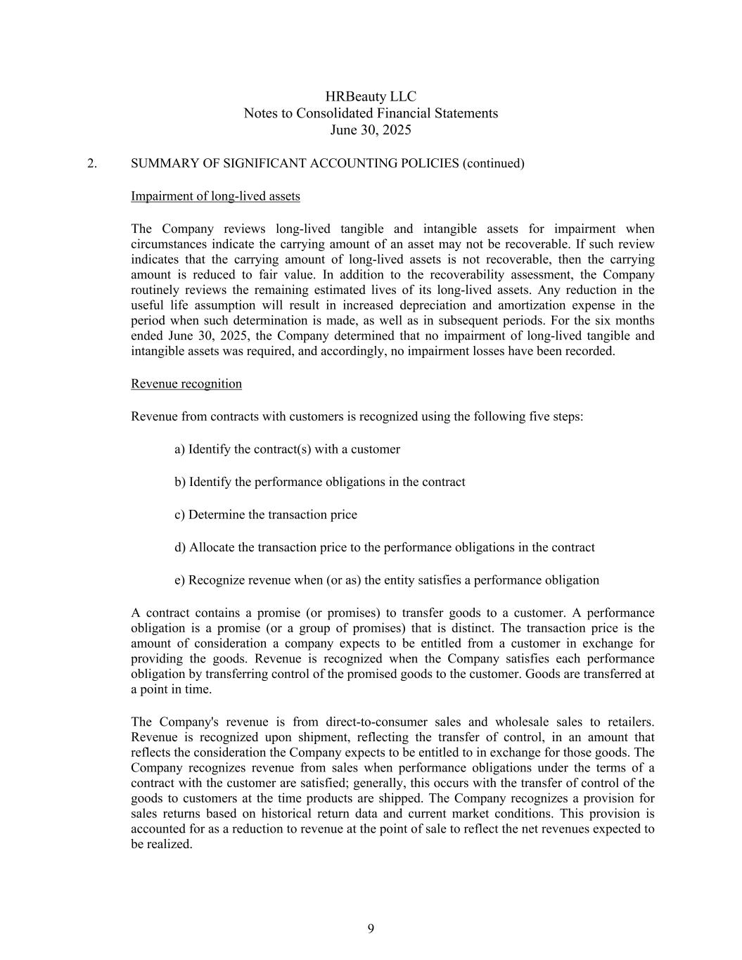 HRBeauty LLC合并财务报表附注2025年6月30日2。重要会计政策概要(续)长期资产减值当情况表明资产的账面值可能无法收回时,公司对长期有形和无形资产进行减值审查。如果此类审查表明长期资产的账面值无法收回,则将账面值减至公允价值。除可回收性评估外,公司还定期审查其长期资产的剩余估计寿命。使用寿命假设的任何减少都将导致作出此类确定的期间以及后续期间的折旧和摊销费用增加。截至2025年6月30日止六个月,公司确定不需要对长期存在的有形和无形资产进行减值,因此,没有记录减值损失。收入确认来自与客户的合同的收入采用以下五个步骤确认:a)识别与客户的合同b)识别合同中的履约义务c)确定交易价格d)将交易价格分配给合同中的履约义务e)当主体履行履约义务时(或作为)确认收入合同中包含向客户转让货物的承诺(或承诺)。履约义务是一种明确的承诺(或一组承诺)。交易价格是公司预期有权从客户那里获得的作为提供货物的交换的对价金额。当公司通过将承诺商品的控制权转让给客户来履行各项履约义务时确认收入。货物在某个时间点转运。该公司的收入来自直接面向消费者的销售和对零售商的批发销售。收入在装运时确认,反映控制权转移,金额反映公司预期有权获得的对价,以换取这些货物。公司在与客户的合同条款下的履约义务得到满足时确认销售收入;通常,这种情况发生在产品发货时将货物控制权转移给客户。公司根据历史退货数据和当前市场情况确认销售退货准备。这笔拨备作为销售点收入的减少入账,以反映预计将实现的净收入。9