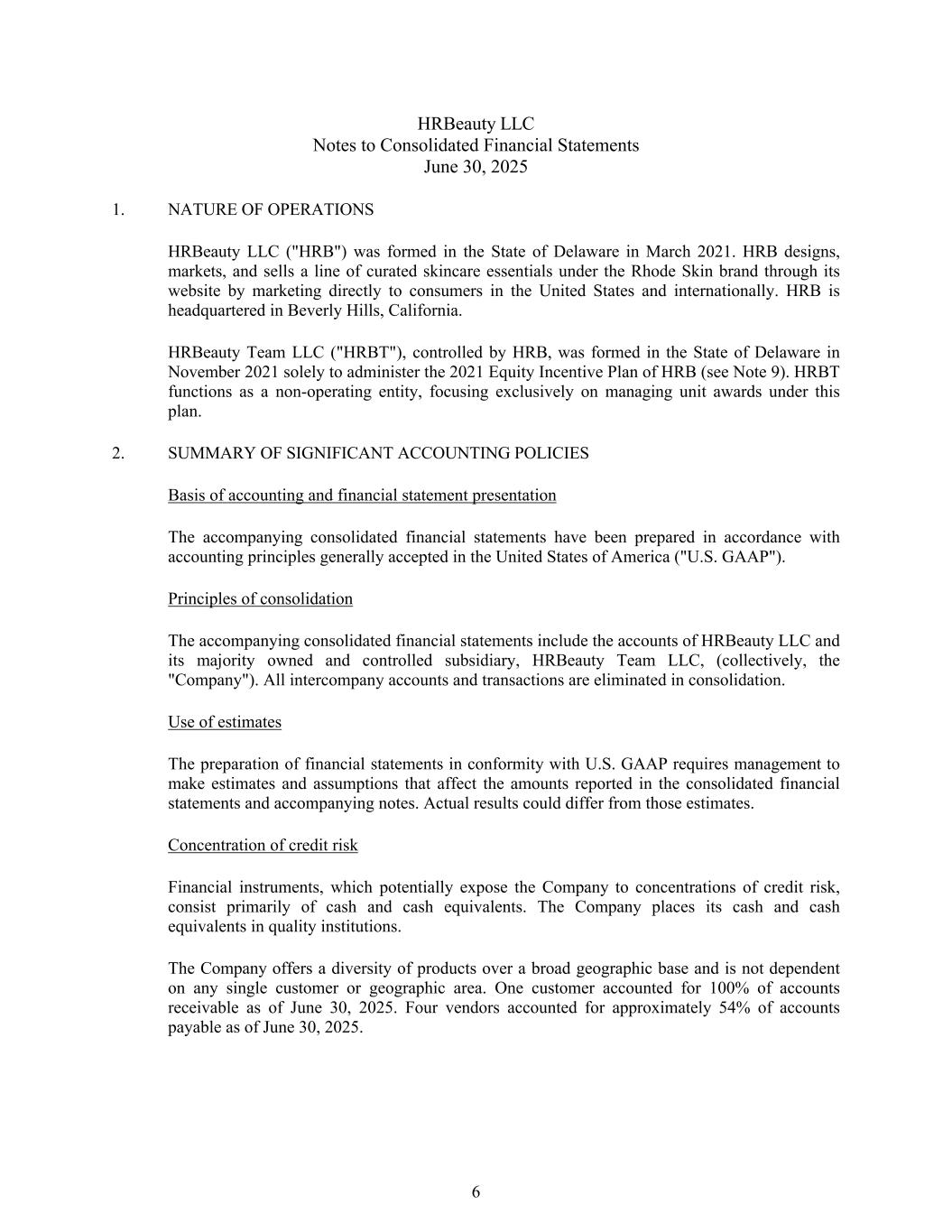 HRBeauty LLC合并财务报表附注2025年6月30日1。Nature of Operations HRBeauty LLC(“HRB”)于2021年3月在特拉华州成立。HRB通过其网站以Rhode Skin品牌设计、营销和销售一系列精选的护肤必需品,直接向美国和国际上的消费者进行营销。HRB的总部位于加利福尼亚州的比佛利山庄。HRBeauty Team LLC(“HRBT”),由HRB控股,于2021年11月在特拉华州成立,专门管理HRB 2021年股权激励计划(见注9)。HRBT作为非运营实体发挥职能,专门专注于管理该计划下的单位奖励。2.重要会计政策摘要会计基础和财务报表列报所附合并财务报表是根据美利坚合众国普遍接受的会计原则(“美国公认会计原则”)编制的。合并原则随附的合并财务报表包括HRBeauty LLC及其拥有和控制多数的子公司HRBeauty Team LLC(统称“公司”)的账目。所有公司间账户和交易在合并中消除。使用估计按照美国公认会计原则编制财务报表要求管理层做出影响合并财务报表和附注中报告的金额的估计和假设。实际结果可能与这些估计不同。信用风险集中可能使公司面临信用风险集中的金融工具主要由现金和现金等价物组成。该公司将其现金和现金等价物存放在优质机构。该公司在广泛的地理基础上提供多样化的产品,不依赖于任何单一客户或地理区域。1个客户截至2025年6月30日应收账款占比100%。截至2025年6月30日,四家供应商约占应付账款的54%。6
