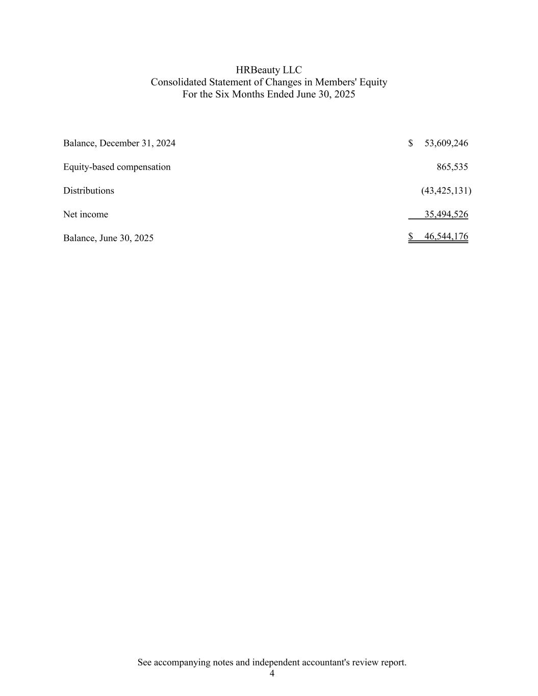 HRBeauty LLC截至2025年6月30日止六个月的合并会员权益变动表2024年12月31日余额53,609,246美元基于股权的薪酬865,535分配(43,425,131)净收入35,494,526余额,2025年6月30日46,544,176美元见附注和独立会计师审阅报告。4