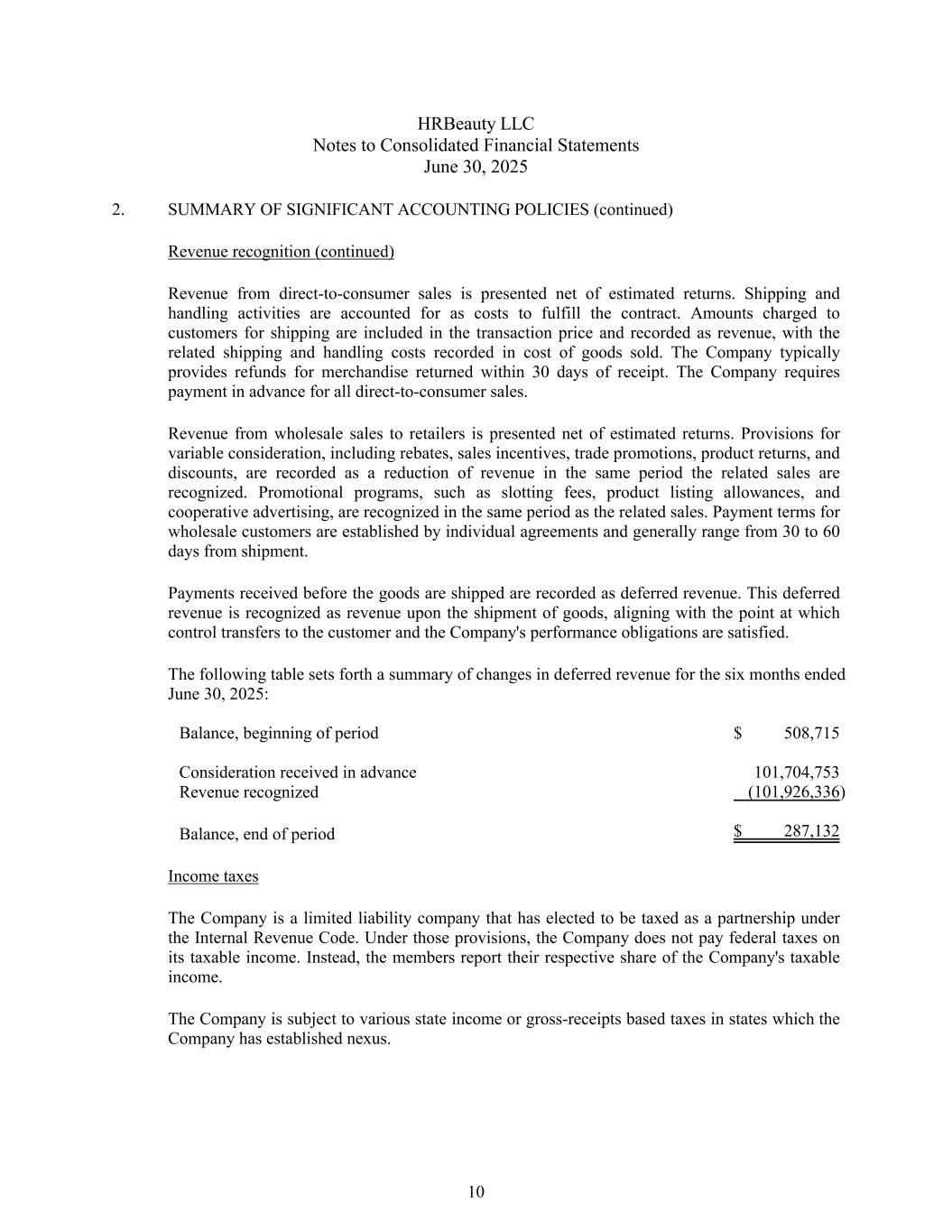 HRBeauty LLC合并财务报表附注2025年6月30日2。重要会计政策摘要(续)收入确认(续)直接面向消费者销售的收入列报为扣除估计退货后的净额。运输和装卸活动作为履行合同的成本入账。向客户收取的运费金额计入交易价格并记为收入,相关运费和装卸费记为已售商品成本。该公司通常会为收到后30天内退回的商品提供退款。公司要求所有直接面向消费者的销售都要提前付款。对零售商的批发销售收入列报为扣除估计退货后的净额。可变对价拨备,包括返利、销售奖励、贸易促销、产品退货、折扣等,在相关销售确认的同一期间作为收入减少入账。促销方案,如槽位费、产品上市津贴、合作广告等,与相关销售在同一时期确认。批发客户的付款条件由个别协议确定,一般从发货起30至60天不等。货物发运前收到的付款记为递延收入。这一递延收入在货物发运时确认为收入,与控制权转移给客户和公司履约义务得到履行的时点一致。下表列出了截至2025年6月30日止六个月的递延收入变化汇总:余额,期初508,715美元预收对价101,704,753确认收入(101,926,336)余额,期末287,132美元所得税公司是一家有限责任公司,根据《国内税收法》选择作为合伙企业征税。根据这些规定,公司不为其应税收入缴纳联邦税。相反,成员报告他们各自在公司应税收入中所占的份额。公司须在公司已建立联系的州缴纳各种州收入或基于总收入的税收。10
