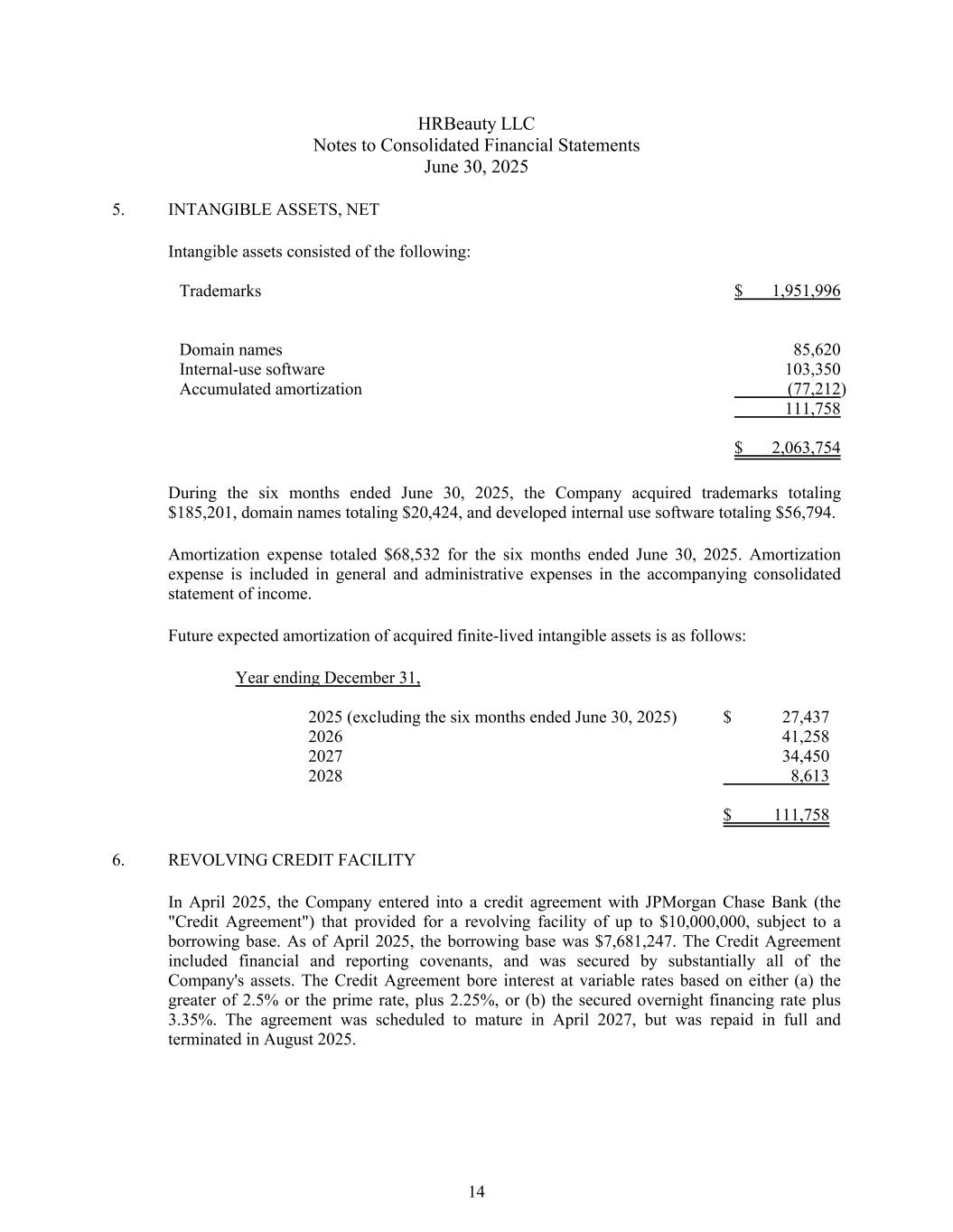 HRBeauty LLC合并财务报表附注2025年6月30日5。无形资产,净无形资产包括:商标1,951,996美元域名85,620内部使用软件103,350累计摊销(77,212)111,758美元2,063,754美元截至2025年6月30日的六个月期间,公司获得的商标总额为185,201美元,域名总额为20,424美元,开发的内部使用软件总额为56,794美元。截至2025年6月30日的六个月,摊销费用总计68,532美元。摊销费用包括在随附的综合收益表的一般及行政费用中。所购有限寿命无形资产的未来预期摊销如下:截至2025年12月31日止年度(不包括截至2025年6月30日止六个月)27,437202641,258202734,45020288,613美元111,7586。循环信贷额度于2025年4月,公司与摩根大通银行订立信贷协议(“信贷协议”),该协议规定提供最高10,000,000美元的循环贷款,但须以借款为基础。截至2025年4月,借款基数为7681247美元。信贷协议包括财务和报告契约,并由公司几乎所有资产作担保。信贷协议按浮动利率计息,利率基于(a)2.5%或最优惠利率中的较大者,加上2.25%,或(b)有担保隔夜融资利率加上3.35%。该协议原定于2027年4月到期,但已全额偿还,并于2025年8月终止。14