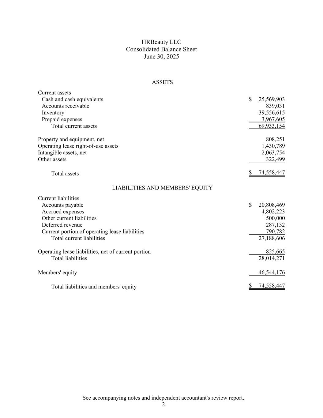 HRBeauty LLC合并资产负债表2025年6月30日资产流动资产现金和现金等价物25,569,903美元应收账款839,031存货39,556,615预付费用3,967,605流动资产总额69,933,154财产和设备净额808,251经营租赁使用权资产1,430,789 无形资产,净值净额2,063,754其他资产322,499总资产74,558,447美元负债和成员权益流动负债应付账款20,808,469美元应计费用4,802,223其他流动负债500,000递延收入287,132经营租赁负债的流动部分790,782流动负债总额27,188,606经营租赁负债,扣除当期部分825,665负债总额28,014,271成员权益46,544,176负债和成员权益总额74,558,447美元见附注和独立会计师审阅报告。2