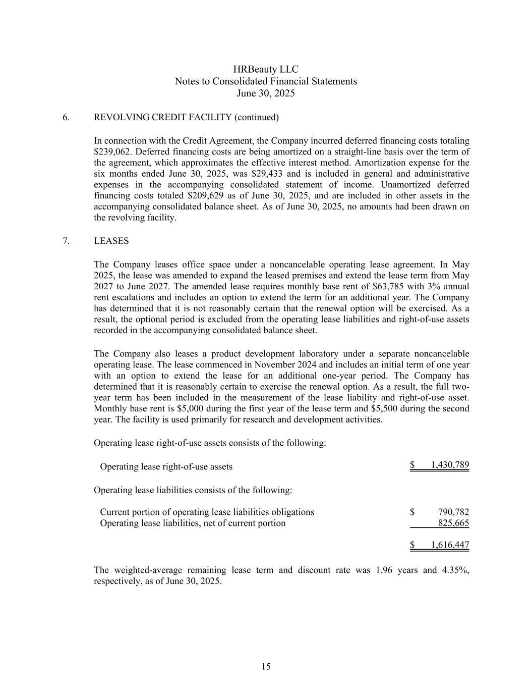 HRBeauty LLC合并财务报表附注2025年6月30日6。循环信贷融资(续)就信贷协议而言,公司产生了总计239062美元的递延融资成本。递延融资成本在协议期限内按直线法摊销,近似于实际利率法。截至2025年6月30日止六个月的摊销费用为29,433美元,包含在随附的综合损益表的一般和管理费用中。截至2025年6月30日,未摊销的递延融资成本总计209,629美元,包含在随附的综合资产负债表的其他资产中。截至2025年6月30日,没有从循环贷款中提取任何金额。7.租赁公司根据不可撤销的经营租赁协议租赁办公空间。2025年5月,租约修订,扩大租赁房地,将租期由2027年5月延长至2027年6月。修改后的租约要求每月基本租金为63,785美元,年租金上涨3%,并包括将期限再延长一年的选择权。公司已确定无法合理确定续期选择权将获行使。因此,任选期间不包括在随附的综合资产负债表中记录的经营租赁负债和使用权资产中。该公司还根据单独的不可撤销经营租赁租赁了一个产品开发实验室。租约于2024年11月开始,包括一年的初始期限,可选择将租约延长一年。公司已确定合理确定行使续期选择权。由此,租赁负债和使用权资产的计量中计入了完整的两年期限。租期第一年每月基本租金为5000美元,第二年为5500美元。该设施主要用于研发活动。经营租赁使用权资产包括:经营租赁使用权资产1,430,789美元经营租赁负债包括:经营租赁负债的流动部分790,782美元经营租赁负债,扣除流动部分825,665美元1,616,447截至2025年6月30日,加权平均剩余租赁期和贴现率分别为1.96年和4.35%。15