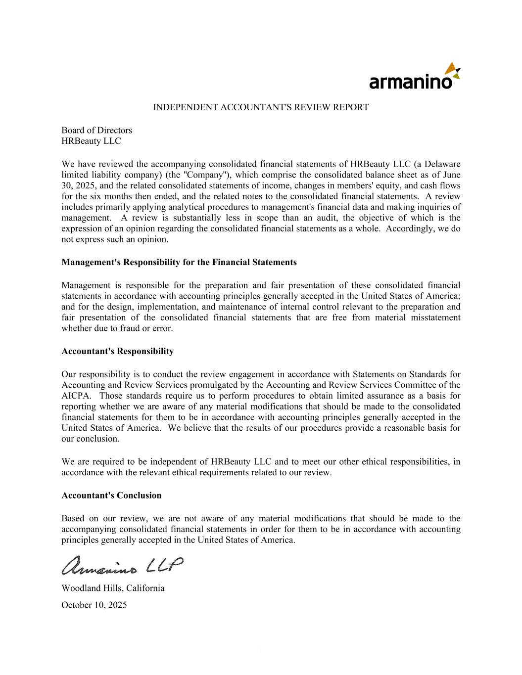 独立会计师的覆核报告董事会HRBeauty LLC我们覆核了随附的HRBeauty LLC(特拉华州有限责任公司)(‘’公司‘’)的合并财务报表,其中包括截至2025年6月30日的合并资产负债表,以及截至该日止六个月的相关合并损益表、成员权益变动表、现金流量表,以及合并财务报表的相关附注。审查主要包括对管理层的财务数据应用分析程序,并对管理层进行查询。审查的范围比审计要小得多,审计的目标是就合并财务报表整体发表意见。因此,我们不发表这样的意见。管理层对财务报表的责任管理层负责根据美利坚合众国普遍接受的会计原则编制和公允列报这些合并财务报表;以及设计、实施和维护与编制和公允列报合并财务报表相关的内部控制,无论是否由于舞弊或错误,均不存在重大错报。会计师的责任我们的责任是根据中注协会计和审查服务委员会颁布的会计和审查服务标准声明进行审查业务。这些准则要求我们履行程序,获得有限保证,作为报告我们是否知道应对合并财务报表进行任何重大修改以使其符合美利坚合众国普遍接受的会计原则的基础。我们认为,我们程序的结果为我们的结论提供了合理的基础。我们被要求独立于HRBeauty LLC,并根据与我们的审查相关的相关道德要求履行我们的其他道德责任。会计师的结论根据我们的审查,我们不知道应对随附的综合财务报表进行任何重大修改,以使其符合美利坚合众国普遍接受的会计原则。加利福尼亚州伍德兰希尔斯2025年10月10日1