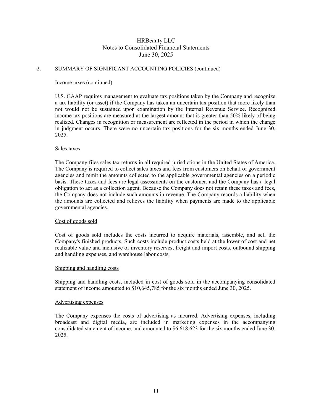 HRBeauty LLC合并财务报表附注2025年6月30日2。重要会计政策摘要(续)所得税(续)美国公认会计原则要求管理层评估公司采取的税务立场,并在公司采取了不确定的税务立场且经美国国税局审查后很可能无法维持的情况下确认一项税务负债(或资产)。确认的所得税头寸以实现可能性大于50%的最大金额计量。确认或计量的变动反映在判断发生变动的期间。截至2025年6月30日止六个月,没有不确定的税务状况。销售税公司在美国所有规定的司法管辖区提交销售税申报表。公司须代表政府机构向客户收取销售税费,并定期将收取的款项汇给适用的政府机构。这些税费是对客户的法定评估,公司负有代收的法定义务。由于公司不保留这些税费,因此公司不将这些金额计入收入。公司在收取款项时记录负债,并在向适用的政府机构付款时免除负债。已售商品成本已售商品成本包括取得材料、组装、销售公司成品所发生的成本。这类成本包括按成本与可变现净值孰低法持有的产品成本,其中包括库存储备、运费及进口成本、外运及装卸费用、仓库人工成本等。运输和装卸费用截至2025年6月30日止六个月,包括在所附综合收益表中销售商品成本中的运输和装卸费用为10,645,785美元。广告费用本公司将广告费用按发生时支出。广告费用,包括广播和数字媒体,包含在随附的综合收益表的营销费用中,截至2025年6月30日的六个月为6,618,623美元。11