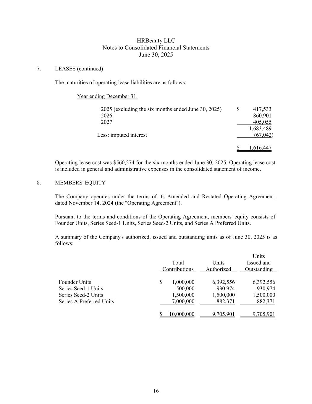 HRBeauty LLC合并财务报表附注2025年6月30日7。租赁(续)经营租赁负债到期情况如下:截至2025年12月31日止年度(不包括截至2025年6月30日止六个月)417,5332026860,9012027405,0551,683,489美元减:推算利息(67,042)1,616,447美元截至2025年6月30日止六个月经营租赁成本为560,274美元。经营租赁成本计入综合收益表的一般及行政开支。8.成员权益公司根据其日期为2024年11月14日的经修订和重述的经营协议(“经营协议”)的条款运营。根据运营协议的条款和条件,成员的权益包括创始人单位、系列种子-1单位、系列种子-2单位和A系列优先单位。截至2025年6月30日,公司授权、已发行和未偿还单位汇总如下:总贡献单位授权单位已发行和未偿还的创始人单位$ 1,000,0006,392,5566,392,556系列种子-1单位500,000930,974930,974系列种子-2单位1,500,0001,500,0001,500,000 A系列优先单位7,000,000882,371,882,371 $ 10,000,0009,705,9019,705,90116