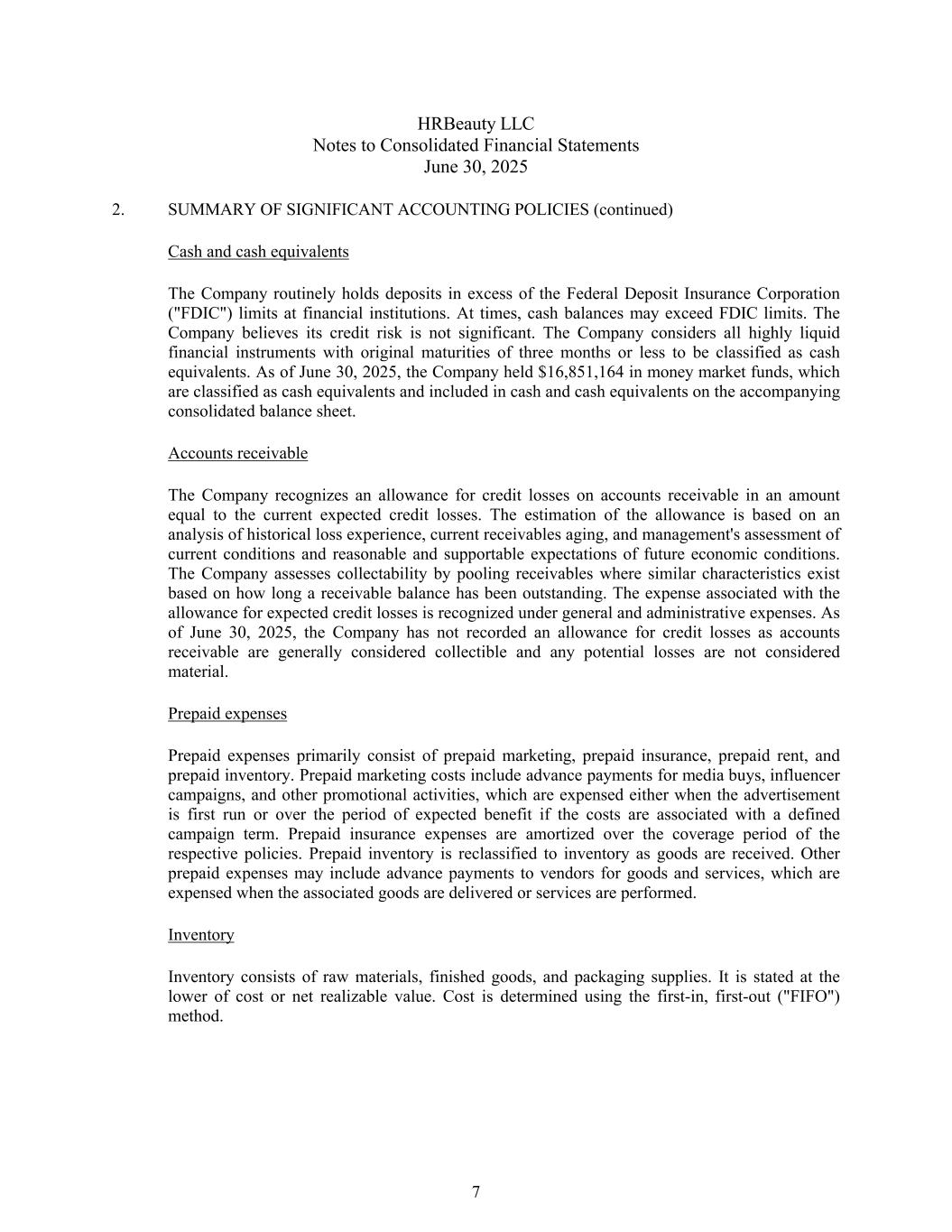 HRBeauty LLC合并财务报表附注2025年6月30日2。重要会计政策摘要(续)现金和现金等价物公司经常在金融机构持有超过联邦存款保险公司(“FDIC”)限额的存款。有时,现金余额可能会超过FDIC的限额。公司认为其信用风险不大。本公司认为所有原到期日为三个月或以下的高流动性金融工具均被归类为现金等价物。截至2025年6月30日,公司持有货币市场基金16,851,164美元,这些基金被归类为现金等价物,并包含在随附的综合资产负债表中的现金和现金等价物中。应收账款本公司确认应收账款信用损失备抵,金额等于当期预期信用损失。拨备的估计是基于对历史损失经验、当前应收账款账龄、管理层对当前状况的评估以及对未来经济状况的合理和可支持的预期的分析。公司根据应收账款余额未偿还的时间,通过在存在类似特征的情况下汇集应收账款来评估可收回性。与预期信贷损失备抵有关的开支在一般及行政开支项下确认。截至2025年6月30日,由于应收账款通常被认为是可收回的,任何潜在损失都不被视为重大,因此公司没有记录信用损失备抵。预付费用预付费用主要包括预付营销、预付保险、预付租金、预付存货。预付营销成本包括媒体购买、网红活动和其他促销活动的预付款,如果成本与定义的活动期限相关,则在首次投放广告时或在预期收益期间将其支出。预付保险费用在各自保单的保障期间内摊销。预付存货在收到货物时重新分类为存货。其他预付费用可能包括预付给供应商的货物和服务款项,这些款项在相关货物交付或提供服务时计入费用。库存库存由原材料、制成品、包装用品组成。以成本与可变现净值孰低者列示。成本采用先进先出(“FIFO”)法确定。7
