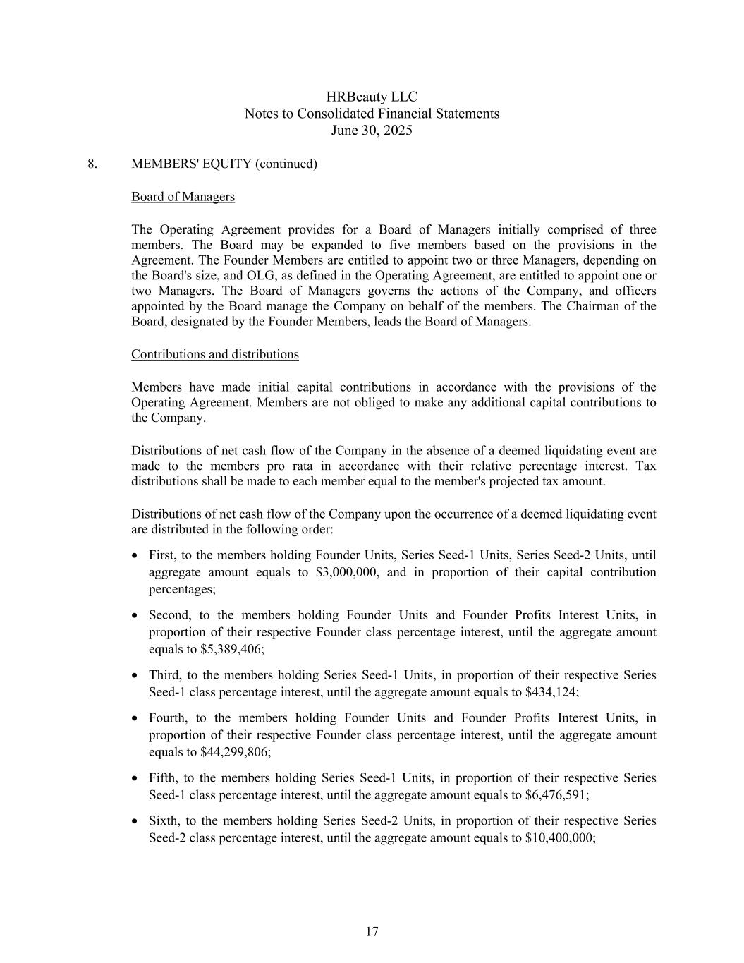 HRBeauty LLC合并财务报表附注2025年6月30日8。成员的股权(续)管理委员会经营协议规定的管理委员会最初由三名成员组成。理事会可根据《协定》的规定扩大为五名成员。创始人成员有权任命两名或三名经理,具体取决于董事会的规模,而OLG(根据运营协议的定义)有权任命一名或两名经理。管理委员会管理公司的行动,由董事会任命的高级管理人员代表成员管理公司。董事长,由创始人成员指定,领导管理委员会。出资和分配成员已根据运营协议的规定进行了首次出资。会员没有义务向公司作出任何额外的出资。在不发生视同清算事件的情况下,公司净现金流的分配按照成员的相对百分比利息按比例分配给成员。应向每个成员分配相当于该成员预计税额的税款。当视同清算事件发生时,公司净现金流的分配按以下顺序分配:第一,分配给持有Founder Units、Series Seed-1 Units、Series Seed-2 Units的成员,直至总金额等于3,000,000美元,并按其出资百分比的比例;第二,分配给持有Founder Units和Founder Founder Profits Interest Units的成员,按其各自的Founder Class百分比权益的比例,直至总金额等于5,389,406美元;第三,分配给持有Series Seed-1 Units的成员,按其各自的Series Seed-1 Class百分比权益的比例,直至总金额等于434,124美元;第四,向持有Founder Units和Founder Profits Interest Units的成员,按其各自的Founder Class百分比权益的比例,直至总金额等于44,299,806美元;第五,向持有Series Seed-1 Units的成员,按其各自的Series Seed-1 Class百分比权益的比例,直至总金额等于6,476,591美元;第六,向持有Series Seed-2 Units的成员,按其各自的Series Seed-2 Class百分比权益的比例,直至总金额等于10,400,000美元;17