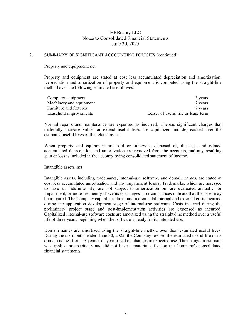HRBeauty LLC合并财务报表附注2025年6月30日2。重要会计政策概要(续)财产和设备、净财产和设备按成本减累计折旧和摊销列报。财产和设备的折旧和摊销在以下估计可使用年限内采用直线法计算:计算机设备3年机械设备7年家具和固定装置7年租赁物改良使用年限或租赁期较短的正常维修和保养在发生时计入费用,而大幅增加价值或延长使用寿命的重大费用则在相关资产的估计可使用年限内资本化和折旧。当财产和设备被出售或以其他方式处置时,成本和相关的累计折旧和摊销将从账目中移除,由此产生的任何收益或损失将计入随附的综合收益表。无形资产,净值无形资产净额,包括商标、内部使用的软件和域名,按成本减去累计摊销和任何减值亏损后列示。被评估为使用寿命不确定的商标不进行摊销,但每年进行减值评估,如果事件或情况变化表明资产可能发生减值,则更频繁地进行评估。公司将内部使用软件应用开发阶段发生的直接和增量内外部成本资本化。在初步项目阶段和实施后活动期间发生的成本在发生时计入费用。资本化的内部使用软件成本采用直线法在三年的使用寿命内摊销,从软件达到预定可使用状态时开始。域名采用直线法在其预计可使用年限内摊销。截至2025年6月30日止六个月,公司根据预期用途的变化,将其域名的预计使用寿命从15年修订为1年。该预计变动为前瞻性应用,对公司合并报表不产生重大影响。8