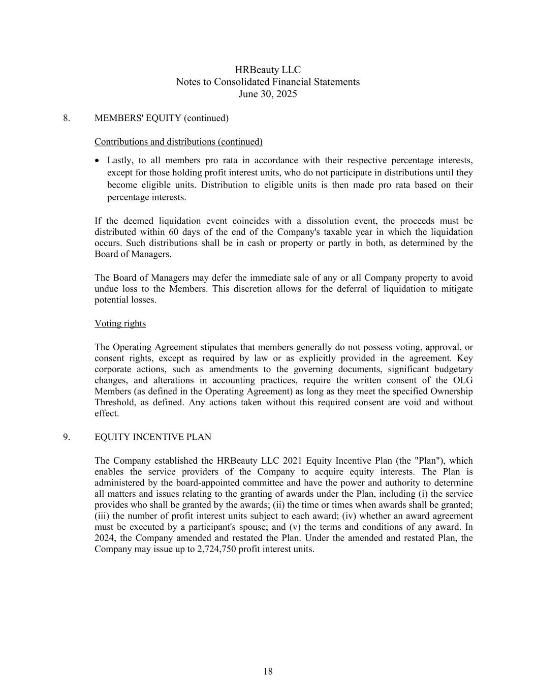 HRBeauty LLC合并财务报表附注2025年6月30日8。成员权益(续)贡献和分配(续)最后,按照各自的百分比权益按比例分配给所有成员,但持有盈利权益单位的成员除外,他们在成为合格单位之前不参与分配。然后根据合格单位的百分比权益按比例分配给合格单位。如果视同清算事件与解散事件重合,收益必须在清算发生的公司纳税年度结束之日起60天内分配完毕。此类分配应以现金或财产或部分以两者的形式进行,由管理委员会决定。管理委员会可推迟立即出售任何或所有公司财产,以避免成员遭受不应有的损失。这一酌处权允许推迟清算以减轻潜在损失。投票权运营协议规定,成员一般不拥有投票权、核准权或同意权,除非法律要求或协议中明确规定。关键的公司行动,例如对管理文件的修订、重大的预算变化以及会计惯例的改变,只要符合定义中规定的特定所有权门槛,就需要OLG成员(如运营协议中所定义)的书面同意。未经此必要同意而采取的任何行动均为无效和无效。9.股权激励计划公司设立HRBeauty LLC 2021年股权激励计划(“计划”),该计划使公司的服务提供商能够获得股权。该计划由董事会委任的委员会管理,并有权决定与根据该计划授予奖励有关的所有事项和问题,包括(i)服务所提供的人应由奖励授予;(ii)授予奖励的时间或次数;(iii)受每项奖励规限的利润权益单位数目;(iv)奖励协议是否必须由参与者的配偶签署;以及(v)任何奖励的条款和条件。2024年,公司对该计划进行了修订和重述。根据经修订及重列的计划,公司最多可发行2,724,750个盈利利息单位。18