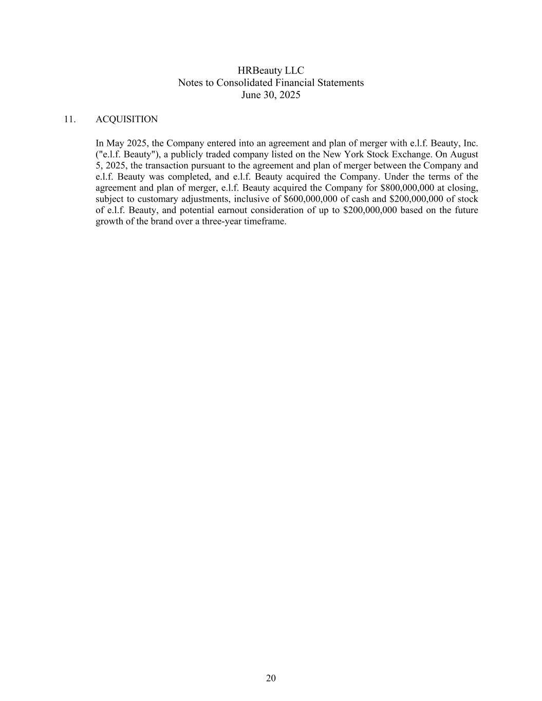 HRBeauty LLC合并财务报表附注2025年6月30日11。收购于2025年5月,公司与于纽约证券交易所上市的上市公司e.l.f.美容,Inc.(“e.l.f.美容”)订立合并协议及计划。于2025年8月5日,根据公司与e.l.f.美容合并的协议及计划进行的交易已完成,e.l.f.美容收购公司。根据协议条款和合并计划,e.l.f.美容在交易结束时以800,000,000美元的价格收购了该公司,但须按惯例进行调整,其中包括600,000,000美元的现金和200,000,000美元的e.l.f.美容股票,以及根据该品牌未来在三年时间范围内的增长情况而得出的高达200,000,000美元的潜在盈利对价。20